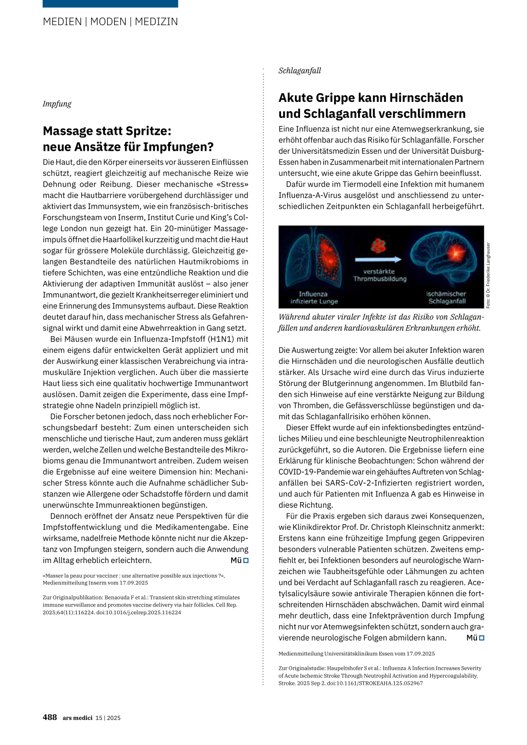 Für die Praxis ergeben sich daraus zwei Konsequenzen, wie Klinikdirektor Prof. Dr. Christoph Kleinschnitz anmerkt: Erstens kann eine frühzeitige Impfung gegen Grippeviren besonders vulnerable Patienten schützen. Zweitens empfiehlt er, bei Infektionen besonders auf neurologische Warnzeichen wie Taubheitsgefühle oder Lähmungen zu achten und bei Verdacht auf Schlaganfall rasch zu reagieren. Acetylsalicylsäure sowie antivirale Therapien können die fortschreitenden Hirnschäden abschwächen. Damit wird einmal mehr deutlich, dass eine Infektprävention durch Impfung nicht nur vor Atemwegsinfekten schützt, sondern auch gravierende neurologische Folgen abmildern kann. Mü