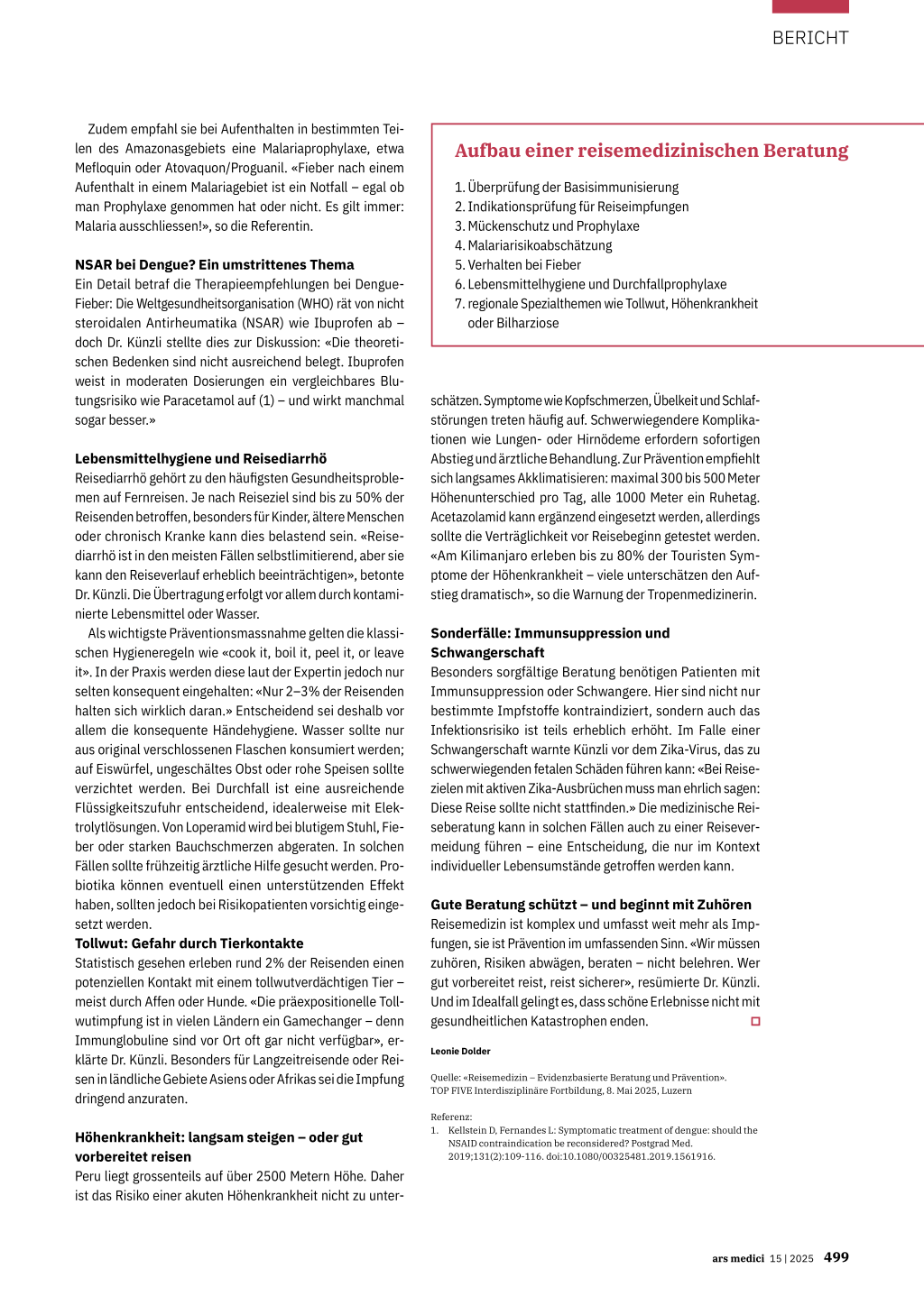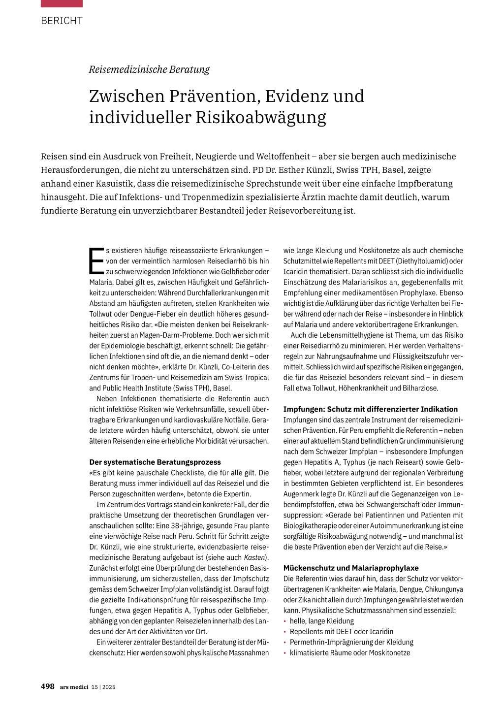 Gute Beratung schützt – und beginnt mit Zuhören Reisemedizin ist komplex und umfasst weit mehr als Impfungen, sie ist Prävention im umfassenden Sinn. «Wir müssen zuhören, Risiken abwägen, beraten – nicht belehren. Wer gut vorbereitet reist, reist sicherer», resümierte Dr. Künzli. Und im Idealfall gelingt es, dass schöne Erlebnisse nicht mit gesundheitlichen Katastrophen enden.