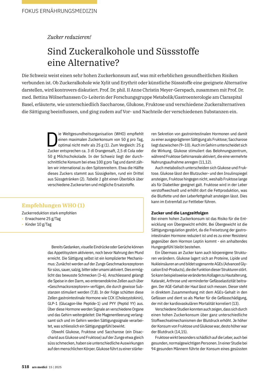 Quelle: Nutrition 2025, 24. Dreiländerkongress Ernährung, 22.–24.5.2025, St. Gallen. Prof. Dr. phil. II Anne Christin Meyer-Gerspach, St. Clara Forschung AG, St. Claraspital: «Zucker und Zuckeralternativen, Appetit und Sättigungsmechanismen»