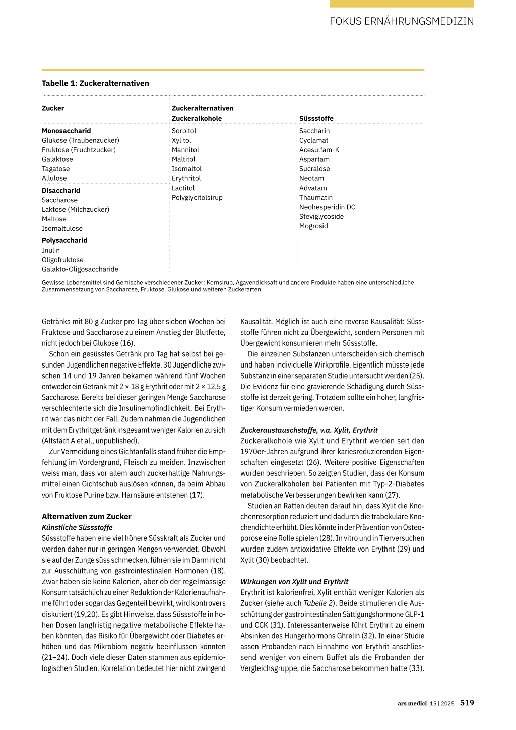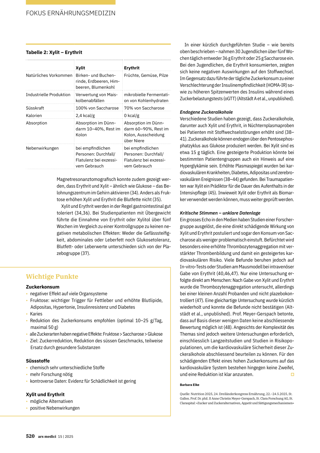 Kritische Stimmen – unklare Datenlage Ein grosses Echo in den Medien haben Studien einer Forscher gruppe ausgelöst, die eine direkt schädigende Wirkung von Xylit und Erythrit postuliert und sogar den Konsum von Sac charose als weniger problematisch einstuft. Befürchtet wird besonders eine erhöhte Thrombozytenaggregation mit ver stärkter Thrombenbildung und damit ein gesteigertes kar diovaskulären Risiko. Viele Befunde beruhen jedoch auf In-vitro-Tests oder Studien am Mausmodell bei intravenöser Gabe von Erythrit (40,46,47). Nur eine Untersuchung er folgte direkt am Menschen: Nach Gabe von Xylit und Erythrit wurde die Thrombozytenaggregation untersucht, allerdings bei einer kleinen Anzahl Probanden und nicht plazebokon trolliert (47). Eine gleichartige Untersuchung wurde kürzlich wiederholt und konnte die Befunde nicht bestätigen (Alt städt et al., unpublished). Prof. Meyer-Gerspach betonte, dass auf Basis dieser wenigen Daten keine abschliessende Bewertung möglich ist (48). Angesichts der Komplexität des Themas sind jedoch weitere Untersuchungen erforderlich, einschliesslich Langzeitstudien und Studien in Risikopo pulationen, um die kardiovaskuläre Sicherheit dieser Zu ckeralkohole abschliessend beurteilen zu können. Für den schädigenden Effekt eines hohen Zuckerkonsums auf das kardiovaskuläre System bestehen hingegen keine Zweifel, und eine Reduktion ist klar anzuraten.