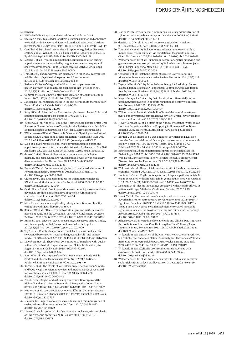 to Guidelines in Switzerland: Results from the First National Nutrition Survey menuCH. Nutrients. 2019;11(5):1117. doi:10.3390/nu11051117 3. Camilleri M. Peripheral mechanisms in appetite regulation. Gastroenterology. 2015 May;148(6):1219-33. doi: 10.1053/j.gastro.2014.09.016. Epub 2014 Sep 21. PMID: 25241326; PMCID: PMC4369188. 4. Lizarbe B et al.: Hypothalamic metabolic compartmentation during appetite regulation as revealed by magnetic resonance imaging and spectroscopy methods. Front Neuroenergetics. 2013;5:6. Published 2013 Jun 13. doi:10.3389/fnene.2013.00006 5. Farré R et al.: Food and symptom generation in functional gastrointestinal disorders: physiological aspects. Am J Gastroenterol. 2013;108(5):698-706. doi:10.1038/ajg.2013.24 6. Fetissov SO: Role of the gut microbiota in host appetite control: bacterial growth to animal feeding behaviour. Nat Rev Endocrinol. 2017;13(1):11-25. doi:10.1038/nrendo.2016.150 7. Cummings DE et al.: Gastrointestinal regulation of food intake. J Clin Invest. 2007;117(1):13-23. doi:10.1172/JCI30227 8. Janssen S et al.: Nutrient sensing in the gut: new roads to therapeutics? Trends Endocrinol Metab. 2013;24(2):92-100. doi:10.1016/j.tem.2012.11.006 9. Kong MF et al.: Effects of oral fructose and glucose on plasma GLP-1 and appetite in normal subjects. Peptides 1999;20:545-551. doi:10.1016/s0196-9781(99)00006-6 10. Yunker AG et al.: Appetite-Regulating Hormones Are Reduced After Oral Sucrose vs Glucose: Influence of Obesity, Insulin Resistance, and Sex. J Clin Endocrinol Metab. 2021;106(3):654–664. doi:10.1210/clinem/dgaa865 11. Wölnerhanssen BK et al.: Dissociable Behavioral, Physiological and Neural Effects of Acute Glucose and Fructose Ingestion: A Pilot Study. PLoS One. 2015 Jun 24;10(6):e0130280. doi:10.1371/journal.pone.0130280 12. Luo S et al.: Differential effects of fructose versus glucose on brain and appetitive responses to food cues and decisions for food rewards. Proc Natl Acad Sci U S A. 2015;112(20):6509-6514. doi:10.1073/pnas.1503358112 13. de Vos LC et al.: Skin autofluorescence is associated with 5-year mortality and cardiovascular events in patients with peripheral artery disease. Arterioscler Thromb Vasc Biol. 2014;34(4):933-938. doi:10.1161/ATVBAHA.113.302731 14. Brands MW et al.: Sodium-retaining effect of insulin in diabetes. Am J Physiol Regul Integr Comp Physiol. 2012 Dec;303(11):R1101-9. doi:10.1152/ajpregu.00390.2012 15. Glushakova O et al.: Fructose induces the inflammatory molecule ICAM-1 in endothelial cells. J Am Soc Nephrol. 2008;19(9):1712-1720. doi:10.1681/ASN.2007121304 16. Geidl-Flueck B et al.: Fructose- and sucrose- but not glucose-sweetened beverages promote hepatic de novo lipogenesis: A randomized controlled trial. J Hepatol. 2021;75(1):46-54. doi:10.1016/j.jhep.2021.02.027 17. https://www.mayoclinic.org/healthy-lifestyle/nutrition-and-healthyeating/in-depth/gout-diet/art-20048524 18. Steinert RE et al.: Effects of carbohydrate sugars and artificial sweeteners on appetite and the secretion of gastrointestinal satiety peptides. Br J Nutr. 2011;105(9):1320-1328. doi:10.1017/S000711451000512X 19. Anton SD et al. Effects of stevia, aspartame, and sucrose on food intake, satiety, and postprandial glucose and insulin levels. Appetite. 2010;55(1):37-43. doi:10.1016/j.appet.2010.03.009 20. Tey SL et al.: Effects of aspartame-, monk fruit-, stevia- and sucrosesweetened beverages on postprandial glucose, insulin and energy intake. Int J Obes (Lond). 2017;41(3):450-457. doi:10.1038/ijo.2016.225 21. Dalenberg JR et al.: Short-Term Consumption of Sucralose with, but Not without, Carbohydrate Impairs Neural and Metabolic Sensitivity to Sugar in Humans. Cell Metab. 2020;31(3):493-502.e7. doi:10.1016/j.cmet.2020.01.014 22. Pang MD et al.: The Impact of Artificial Sweeteners on Body Weight Control and Glucose Homeostasis. Front Nutr. 2021;7:598340. Published 2021 Jan 7. doi:10.3389/fnut.2020.598340 23. Rogers PJ et al.: The effects of low-calorie sweeteners on energy intake and body weight: a systematic review and meta-analyses of sustained intervention studies. Int J Obes (Lond). 2021;45(3):464-478. doi:10.1038/s41366-020-00704-2 24. Pase MP et al.: Sugar- and Artificially Sweetened Beverages and the Risks of Incident Stroke and Dementia: A Prospective Cohort Study. Stroke. 2017;48(5):1139-1146. doi:10.1161/STROKEAHA.116.016027 25. Hunter SR et al.: Low Calorie Sweeteners Differ in Their Physiological Effects in Humans. Nutrients. 2019;11(11):2717. Published 2019 Nov 9. doi:10.3390/nu11112717 26. Mäkinen KK: Sugar alcohols, caries incidence, and remineralization of caries lesions: a literature review. Int J Dent. 2010;2010:981072. doi:10.1155/2010/981072 27. Livesey G: Health potential of polyols as sugar replacers, with emphasis on low glycaemic properties. Nutr Res Rev. 2003;16(2):163-191. doi:10.1079/NRR200371