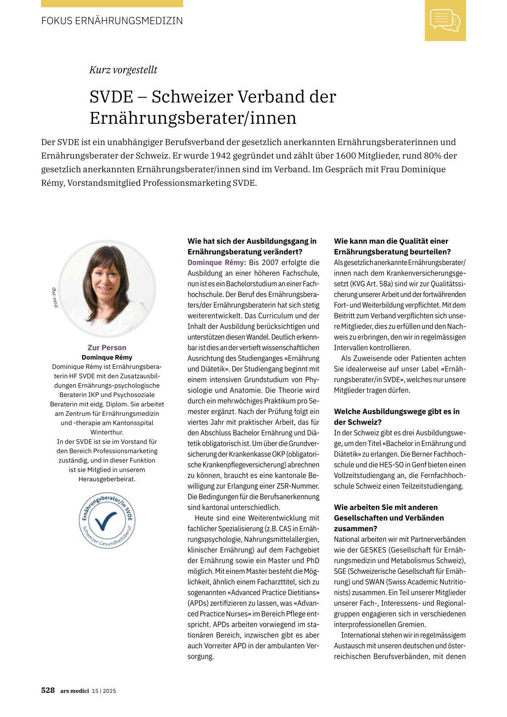 Der SVDE ist ein unabhängiger Berufsverband der gesetzlich anerkannten Ernährungsberaterinnen und Ernährungsberater der Schweiz. Er wurde 1942 gegründet und zählt über 1600 Mitglieder, rund 80% der gesetzlich anerkannten Ernährungsberater/innen sind im Verband. Im Gespräch mit Frau Dominique Rémy, Vorstandsmitglied Professionsmarketing SVDE.
