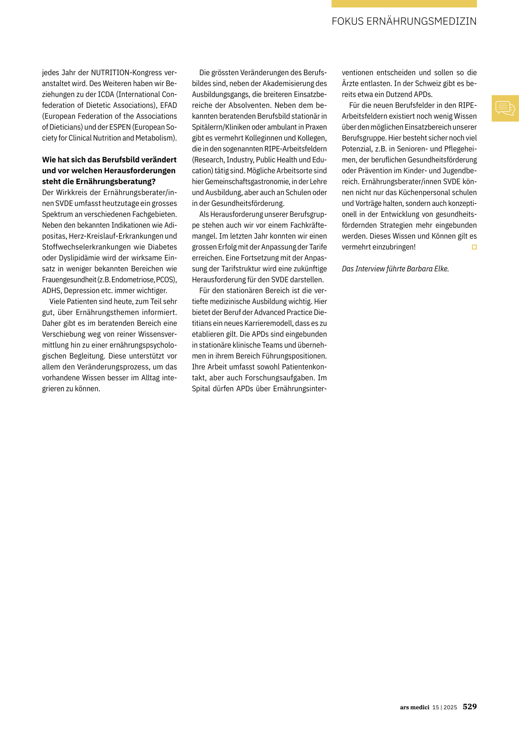 Wie hat sich das Berufsbild verändert und vor welchen Herausforderungen steht die Ernährungsberatung? Der Wirkkreis der Ernährungsberater/innen SVDE umfasst heutzutage ein grosses Spektrum an verschiedenen Fachgebieten. Neben den bekannten Indikationen wie Adipositas, Herz-Kreislauf-Erkrankungen und Stoffwechselerkrankungen wie Diabetes oder Dyslipidämie wird der wirksame Einsatz in weniger bekannten Bereichen wie Frauengesundheit (z.B. Endometriose, PCOS), ADHS, Depression etc. immer wichtiger.