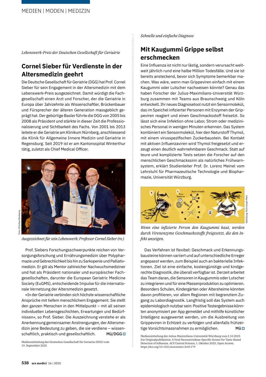 Medienmitteilung der Julius-Maximilians-Universität Würzburg vom 2.10.2025 Zur Originalpublikation: A Viral Neuraminidase-Specific Sensor for Taste-Based Detection of Influenza. ACS Central Science, 1. Oktober 2025, Open Access, https://doi.org/10.1021/acscentsci.5c01179