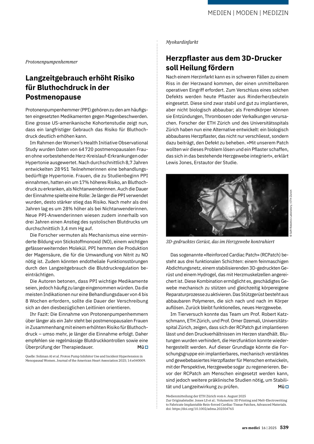 Medienmitteilung der ETH Zürich vom 6. August 2025 Zur Originalstudie: Jones LS et al.: Volumetric 3D Printing and Melt-Electrowriting to Fabricate Implantable Rein-forced Cardiac Tissue Patches, Advanced Materials. doi: https://doi.org/10.1002/adma.202504765