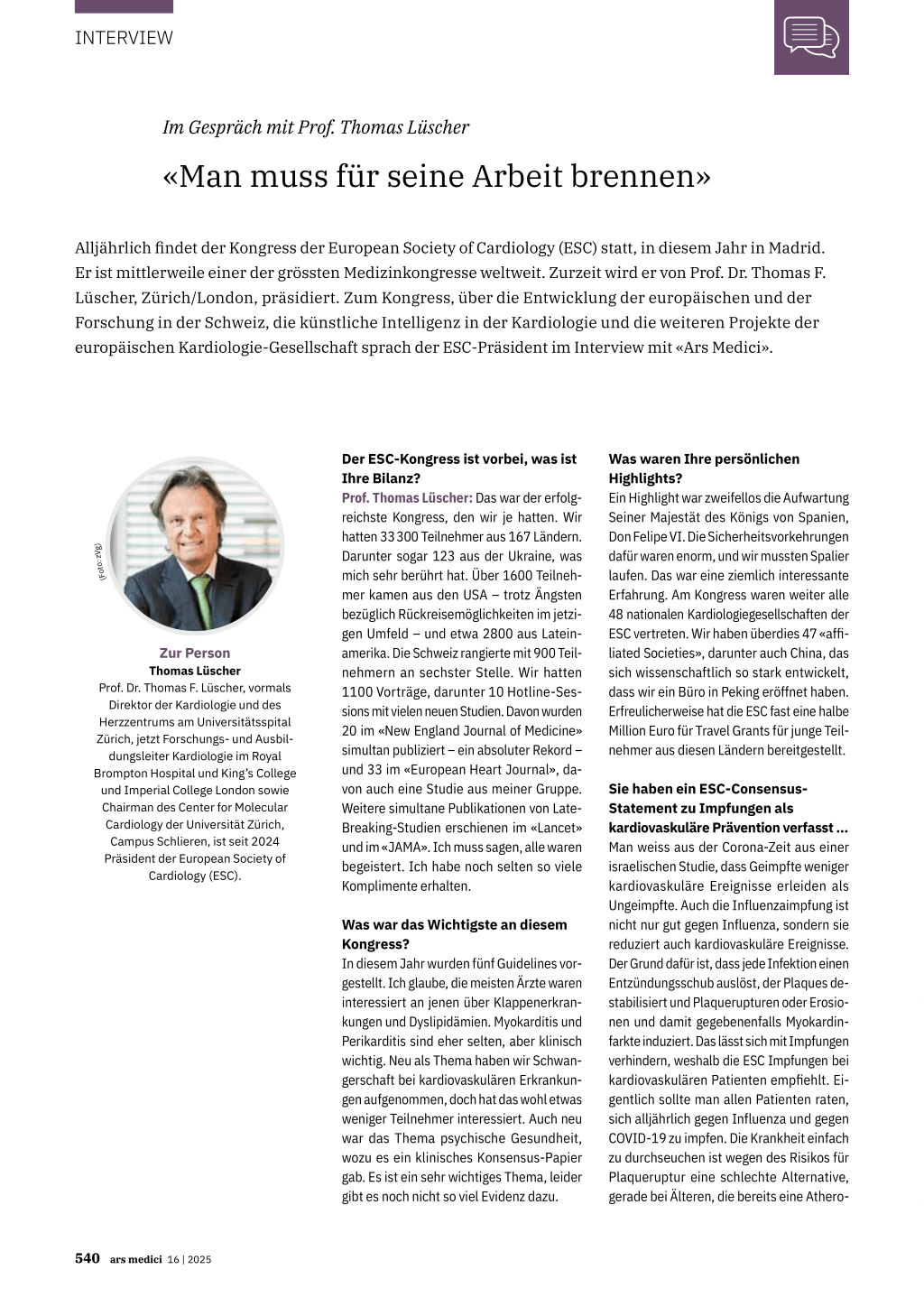 Alljährlich findet der Kongress der European Society of Cardiology (ESC) statt, in diesem Jahr in Madrid. Er ist mittlerweile einer der grössten Medizinkongresse weltweit. Zurzeit wird er von Prof. Dr. Thomas F. Lüscher, Zürich/London, präsidiert. Zum Kongress, über die Entwicklung der europäischen und der Forschung in der Schweiz, die künstliche Intelligenz in der Kardiologie und die weiteren Projekte der europäischen Kardiologie-Gesellschaft sprach der ESC-Präsident im Interview mit «Ars Medici».