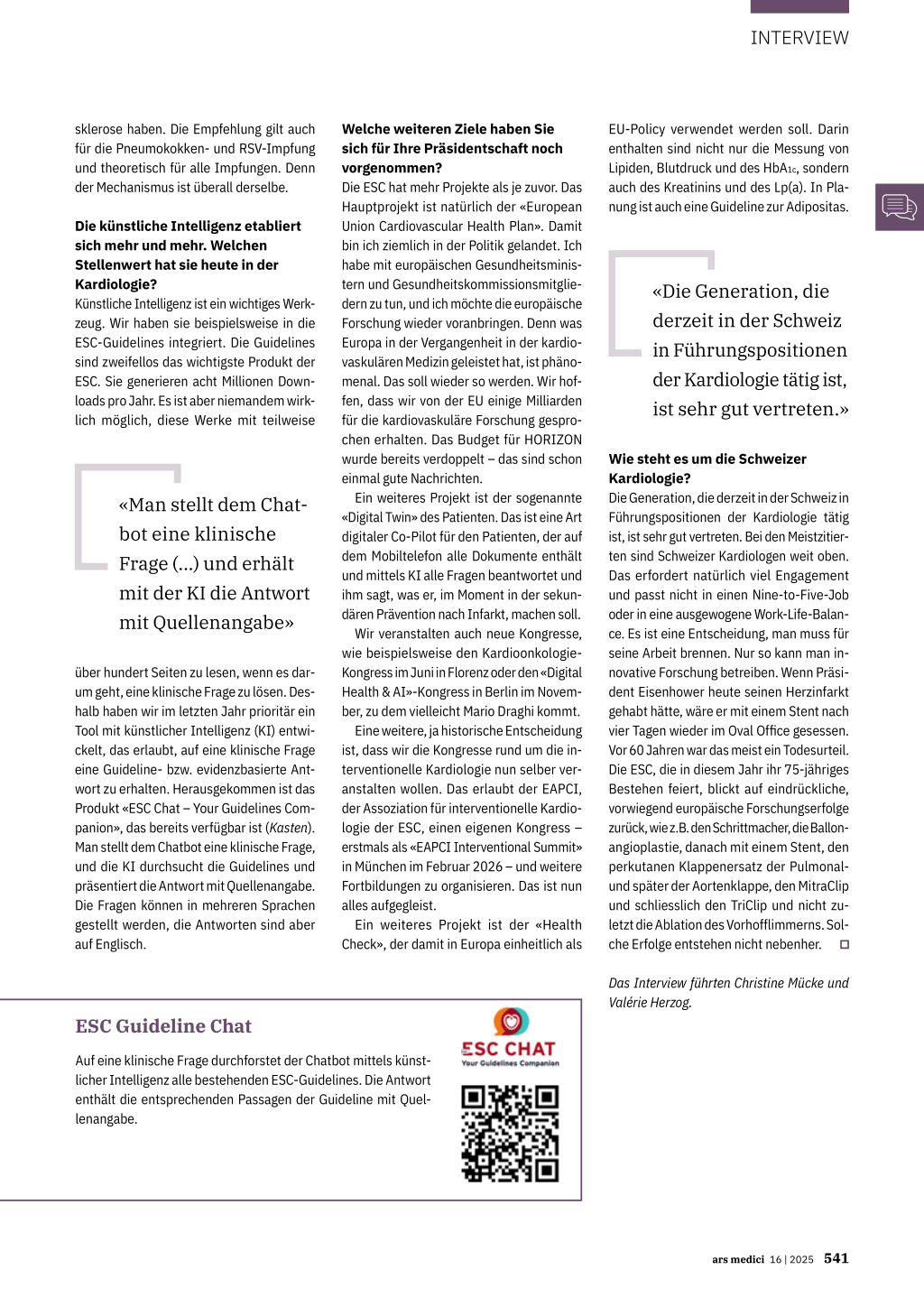 über hundert Seiten zu lesen, wenn es darum geht, eine klinische Frage zu lösen. Deshalb haben wir im letzten Jahr prioritär ein Tool mit künstlicher Intelligenz (KI) entwickelt, das erlaubt, auf eine klinische Frage eine Guideline- bzw. evidenzbasierte Antwort zu erhalten. Herausgekommen ist das Produkt «ESC Chat – Your Guidelines Companion», das bereits verfügbar ist (Kasten). Man stellt dem Chatbot eine klinische Frage, und die KI durchsucht die Guidelines und präsentiert die Antwort mit Quellenangabe. Die Fragen können in mehreren Sprachen gestellt werden, die Antworten sind aber auf Englisch.
