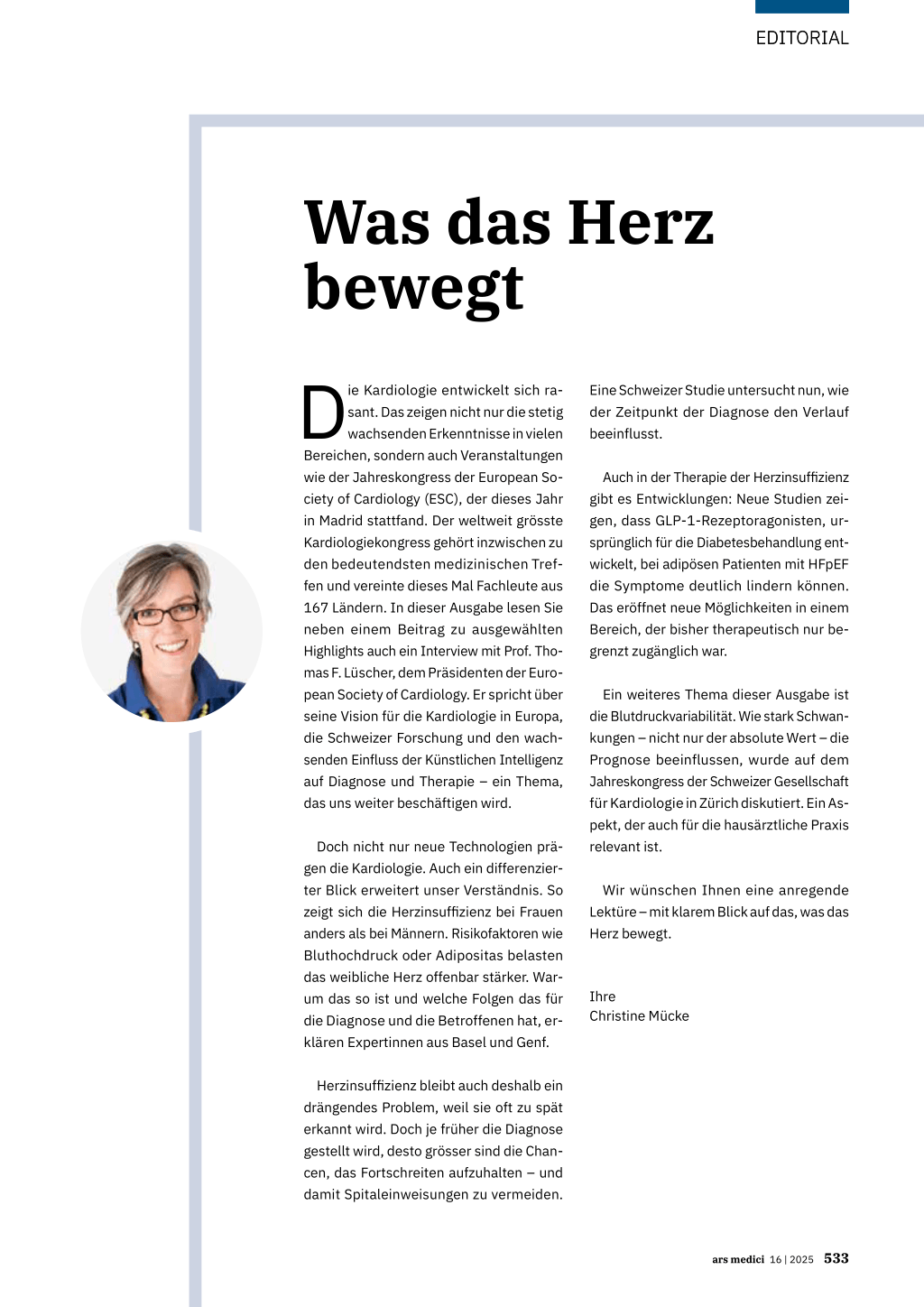 Die Kardiologie entwickelt sich rasant. Das zeigen nicht nur die stetig wachsenden Erkenntnisse in vielen Bereichen, sondern auch Veranstaltungen wie der Jahreskongress der European Society of Cardiology (ESC), der dieses Jahr in Madrid stattfand. Der weltweit grösste Kardiologiekongress gehört inzwischen zu den bedeutendsten medizinischen Treffen und vereinte dieses Mal Fachleute aus 167 Ländern. In dieser Ausgabe lesen Sie neben einem Beitrag zu ausgewählten Highlights auch ein Interview mit Prof. Thomas F. Lüscher, dem Präsidenten der European Society of Cardiology. Er spricht über seine Vision für die Kardiologie in Europa, die Schweizer Forschung und den wachsenden Einfluss der Künstlichen Intelligenz auf Diagnose und Therapie – ein Thema, das uns weiter beschäftigen wird.