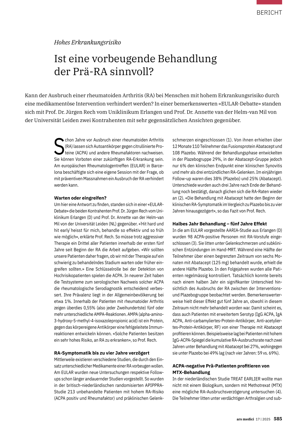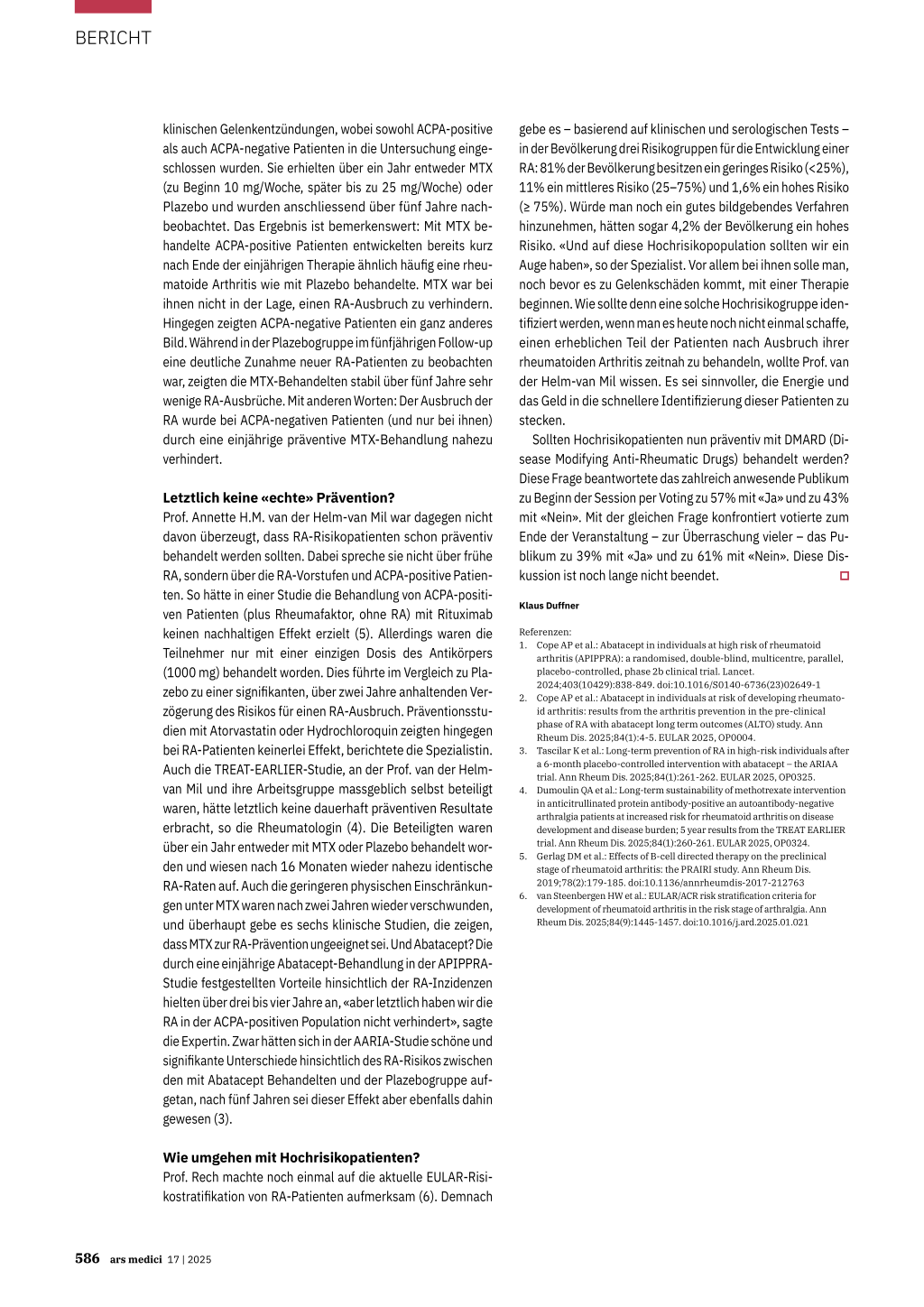gebe es – basierend auf klinischen und serologischen Tests – in der Bevölkerung drei Risikogruppen für die Entwicklung einer RA: 81% der Bevölkerung besitzen ein geringes Risiko (<25%), 11% ein mittleres Risiko (25–75%) und 1,6% ein hohes Risiko (≥ 75%). Würde man noch ein gutes bildgebendes Verfahren hinzunehmen, hätten sogar 4,2% der Bevölkerung ein hohes Risiko. «Und auf diese Hochrisikopopulation sollten wir ein Auge haben», so der Spezialist. Vor allem bei ihnen solle man, noch bevor es zu Gelenkschäden kommt, mit einer Therapie beginnen. Wie sollte denn eine solche Hochrisikogruppe identifiziert werden, wenn man es heute noch nicht einmal schaffe, einen erheblichen Teil der Patienten nach Ausbruch ihrer rheumatoiden Arthritis zeitnah zu behandeln, wollte Prof. van der Helm-van Mil wissen. Es sei sinnvoller, die Energie und das Geld in die schnellere Identifizierung dieser Patienten zu stecken. Sollten Hochrisikopatienten nun präventiv mit DMARD (Disease Modifying Anti-Rheumatic Drugs) behandelt werden? Diese Frage beantwortete das zahlreich anwesende Publikum zu Beginn der Session per Voting zu 57% mit «Ja» und zu 43% mit «Nein». Mit der gleichen Frage konfrontiert votierte zum Ende der Veranstaltung – zur Überraschung vieler – das Pu blikum zu 39% mit «Ja» und zu 61% mit «Nein». Diese Diskussion ist noch lange nicht beendet. Klaus Duffner Referenzen: 1. Cope AP et al.: Abatacept in individuals at high risk of rheumatoid arthritis (APIPPRA): a randomised, double-blind, multicentre, parallel, placebo-controlled, phase 2b clinical trial. Lancet. 2024;403(10429):838-849. doi:10.1016/S0140-6736(23)02649-1 2. Cope AP et al.: Abatacept in individuals at risk of developing rheumatoid arthritis: results from the arthritis prevention in the pre-clinical phase of RA with abatacept long term outcomes (ALTO) study. Ann Rheum Dis. 2025;84(1):4-5. EULAR 2025, OP0004. 3. Tascilar K et al.: Long-term prevention of RA in high-risk individuals after a 6-month placebo-controlled intervention with abatacept – the ARIAA trial. Ann Rheum Dis. 2025;84(1):261-262. EULAR 2025, OP0325. 4. Dumoulin QA et al.: Long-term sustainability of methotrexate intervention in anticitrullinated protein antibody-positive an autoantibody-negative arthralgia patients at increased risk for rheumatoid arthritis on disease development and disease burden; 5 year results from the TREAT EARLIER trial. Ann Rheum Dis. 2025;84(1):260-261. EULAR 2025, OP0324. 5. Gerlag DM et al.: Effects of B-cell directed therapy on the preclinical stage of rheumatoid arthritis: the PRAIRI study. Ann Rheum Dis. 2019;78(2):179-185. doi:10.1136/annrheumdis-2017-212763 6. van Steenbergen HW et al.: EULAR/ACR risk stratification criteria for development of rheumatoid arthritis in the risk stage of arthralgia. Ann Rheum Dis. 2025;84(9):1445-1457. doi:10.1016/j.ard.2025.01.021 Wie umgehen mit Hochrisikopatienten? Prof. Rech machte noch einmal auf die aktuelle EULAR-Risikostratifikation von RA-Patienten aufmerksam (6). Demnach 586 ars medici 17 | 2025