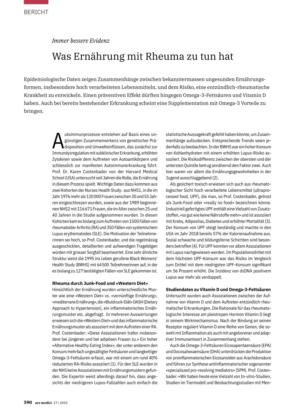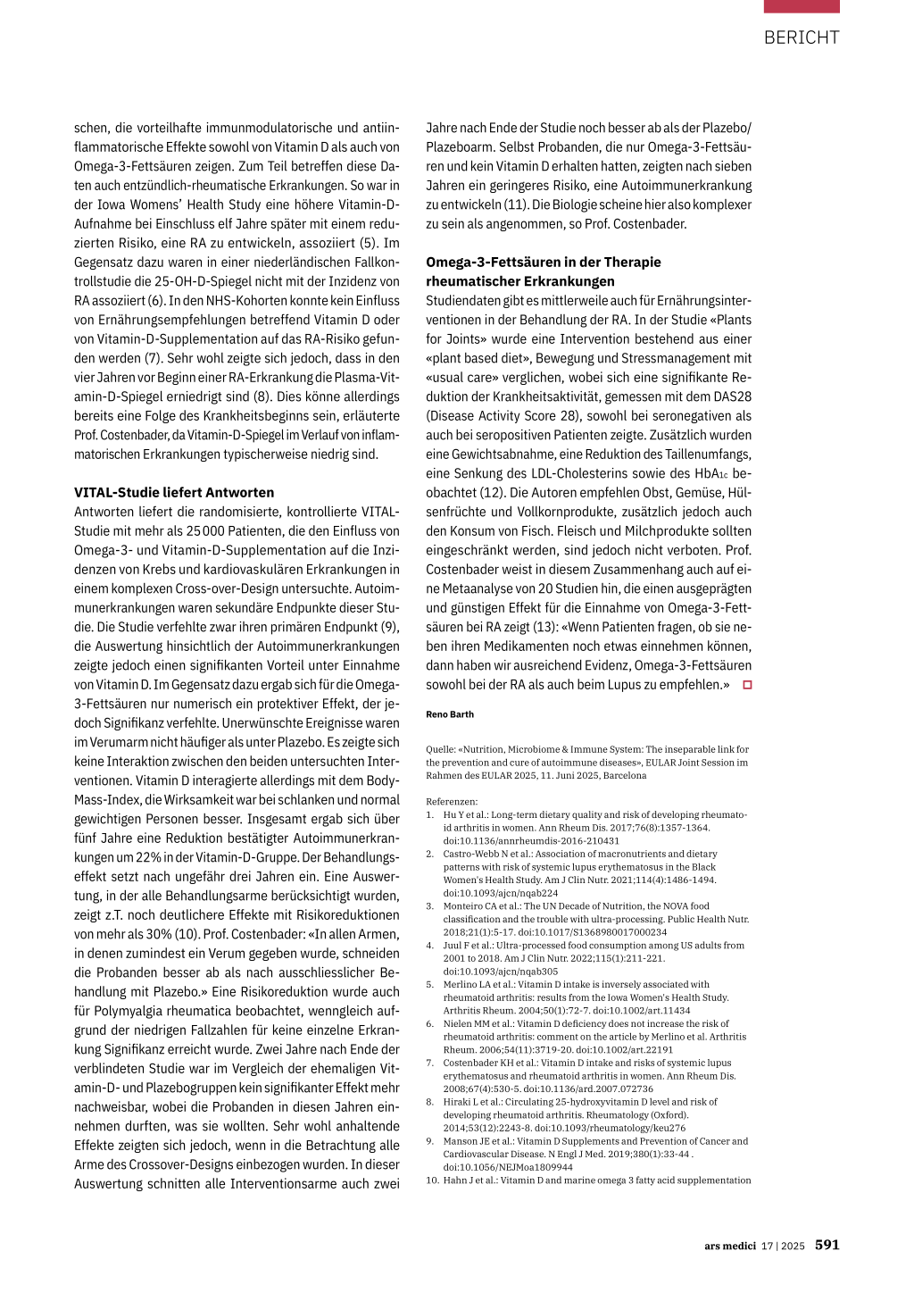 schen, die vorteilhafte immunmodulatorische und antiinflammatorische Effekte sowohl von Vitamin D als auch von Omega-3-Fettsäuren zeigen. Zum Teil betreffen diese Daten auch entzündlich-rheumatische Erkrankungen. So war in der Iowa Womens’ Health Study eine höhere Vitamin-DAufnahme bei Einschluss elf Jahre später mit einem reduzierten Risiko, eine RA zu entwickeln, assoziiert (5). Im Gegensatz dazu waren in einer niederländischen Fallkon trollstudie die 25-OH-D-Spiegel nicht mit der Inzidenz von RA assoziiert (6). In den NHS-Kohorten konnte kein Einfluss von Ernährungsempfehlungen betreffend Vitamin D oder von Vitamin-D-Supplementation auf das RA-Risiko gefunden werden (7). Sehr wohl zeigte sich jedoch, dass in den vier Jahren vor Beginn einer RA-Erkrankung die Plasma-Vit amin-D-Spiegel erniedrigt sind (8). Dies könne allerdings bereits eine Folge des Krankheitsbeginns sein, erläuterte Prof. Costenbader, da Vitamin-D-Spiegel im Verlauf von inflammatorischen Erkrankungen typischerweise niedrig sind.