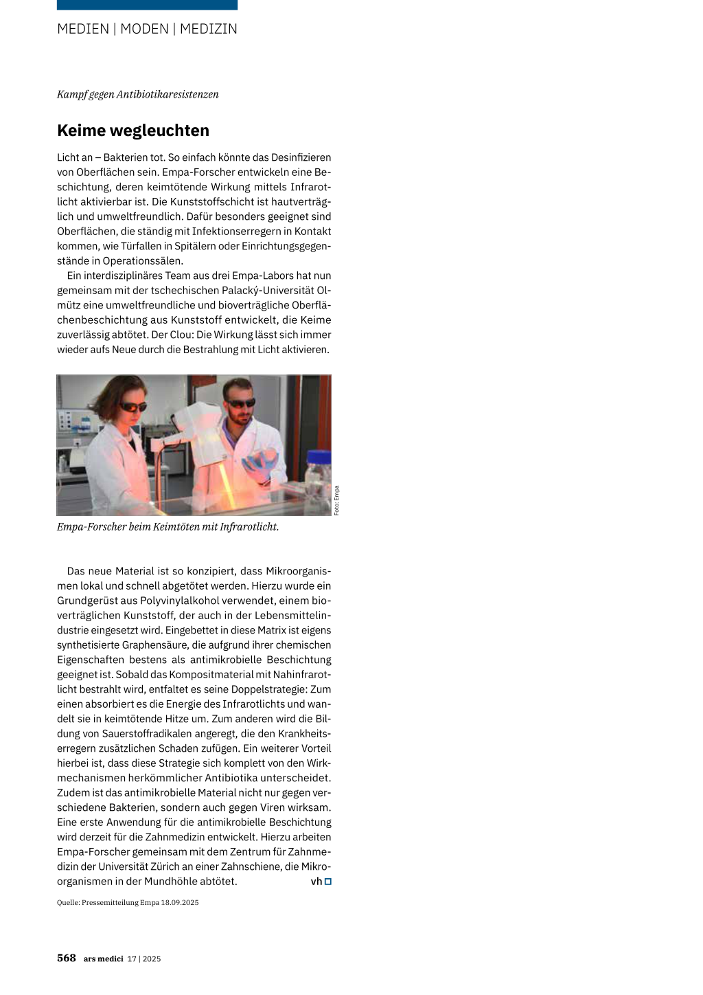 Ein interdisziplinäres Team aus drei Empa-Labors hat nun gemeinsam mit der tschechischen Palacký-Universität Olmütz eine umweltfreundliche und bioverträgliche Oberflächenbeschichtung aus Kunststoff entwickelt, die Keime zuverlässig abtötet. Der Clou: Die Wirkung lässt sich immer wieder aufs Neue durch die Bestrahlung mit Licht aktivieren.