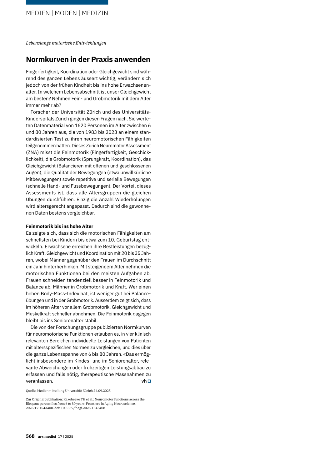 Zur Originalpublikation: Kakebeeke TH et al.: Neuromotor functions across the lifespan: percentiles from 6 to 80 years. Frontiers in Aging Neuroscience. 2025;17:1543408. doi: 10.3389/fnagi.2025.1543408