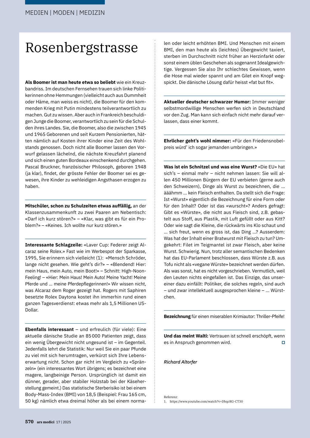 Ebenfalls interessant – und erfreulich (für viele): Eine aktuelle dänische Studie an 85 000 Patienten zeigt, dass ein wenig Übergewicht nicht ungesund ist – im Gegenteil. Jedenfalls lehrt die Statistik: Nur weil Sie ein paar Pfunde zu viel mit sich herumtragen, verkürzt sich Ihre Lebens erwartung nicht. Schon gar nicht im Vergleich zu «Sprän zeln» (ein interessantes Wort übrigens; es bezeichnet eine magere, langbeinige Person. Ursprünglich ist damit ein dünner, gerader, aber stabiler Holzstab bei der Käseher stellung gemeint.) Das statistische Sterberisiko ist bei einem Body-Mass-Index (BMI) von 18,5 (Beispiel: Frau 165 cm, 50 kg) nämlich etwa dreimal höher als bei einem norma