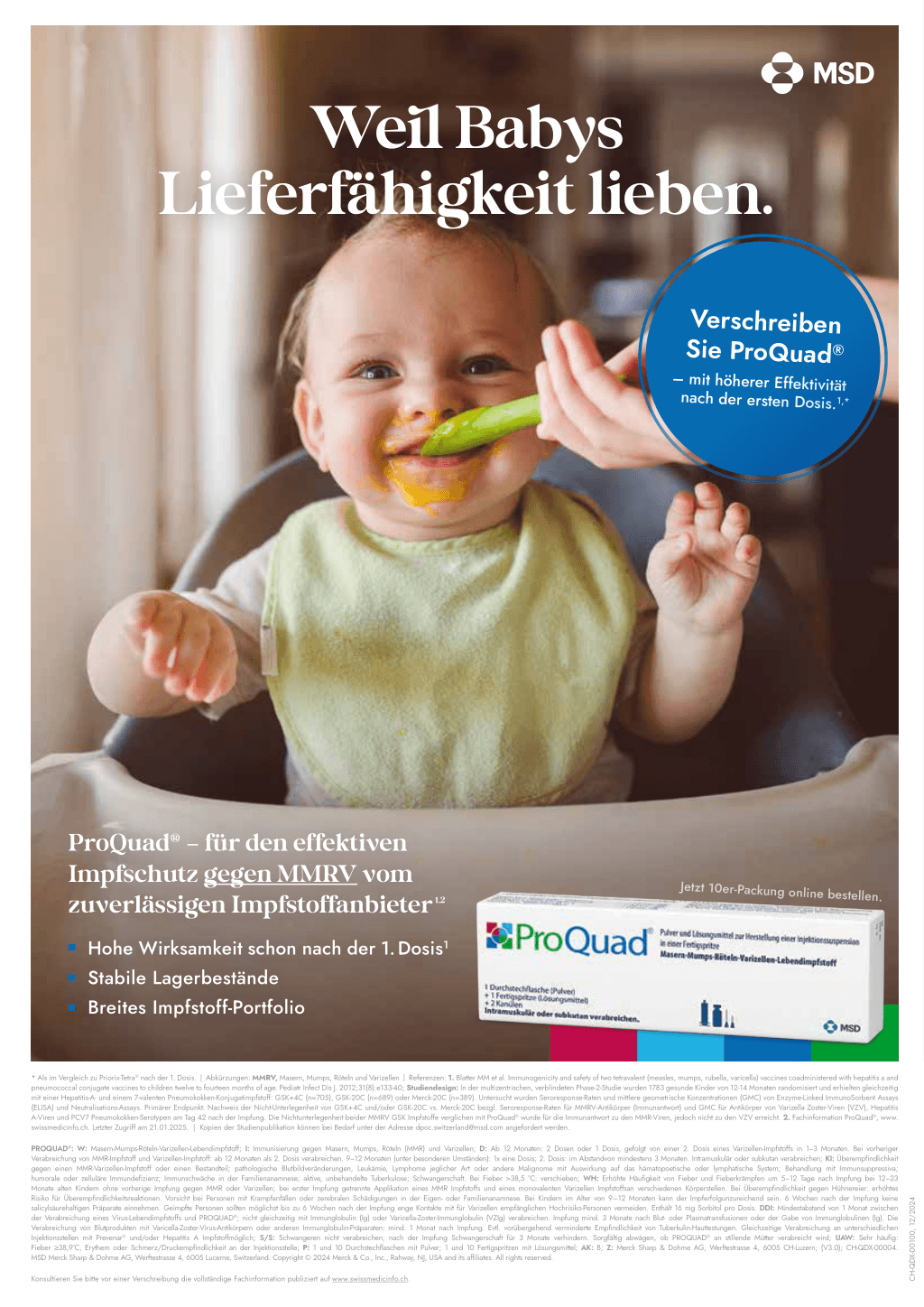 PROQUAD®: W: Masern-Mumps-Röteln-Varizellen-Lebendimpfstoff; I: Immunisierung gegen Masern, Mumps, Röteln (MMR) und Varizellen; D: Ab 12 Monaten: 2 Dosen oder 1 Dosis, gefolgt von einer 2. Dosis eines Varizellen-Impfstoffs in 1−3 Monaten. Bei vorheriger Verabreichung von MMR-Impfstoff und Varizellen-Impfstoff: ab 12 Monaten als 2. Dosis verabreichen. 9−12 Monaten (unter besonderen Umständen): 1x eine Dosis; 2. Dosis: im Abstandvon mindestens 3 Monaten. Intramuskulär oder subkutan verabreichen; KI: Überempfindlichkeit gegen einen MMR-Varizellen-Impfstoff oder einen Bestandteil; pathologische Blutbildveränderungen, Leukämie, Lymphome jeglicher Art oder andere Malignome mit Auswirkung auf das hämatopoetische oder lymphatische System; Behandlung mit Immunsuppressiva; humorale oder zelluläre Immundefizienz; Immunschwäche in der Familienanamnese; aktive, unbehandelte Tuberkulose; Schwangerschaft. Bei Fieber >38,5 °C: verschieben; WH: Erhöhte Häufigkeit von Fieber und Fieberkrämpfen um 5−12 Tage nach Impfung bei 12−23 Monate alten Kindern ohne vorherige Impfung gegen MMR oder Varizellen; bei erster Impfung getrennte Applikation eines MMR Impfstoffs und eines monovalenten Varizellen Impfstoffsan verschiedenen Körperstellen. Bei Überempfindlichkeit gegen Hühnereier: erhöhtes Risiko für Überempfindlichkeitsreaktionen. Vorsicht bei Personen mit Krampfanfällen oder zerebralen Schädigungen in der Eigen- oder Familienanamnese. Bei Kindern im Alter von 9–12 Monaten kann der Impferfolgunzureichend sein. 6 Wochen nach der Impfung keine salicylsäurehaltigen Präparate einnehmen. Geimpfte Personen sollten möglichst bis zu 6 Wochen nach der Impfung enge Kontakte mit für Varizellen empfänglichen Hochrisiko-Personen vermeiden. Enthält 16 mg Sorbitol pro Dosis. DDI: Mindestabstand von 1 Monat zwischen der Verabreichung eines Virus-Lebendimpfstoffs und PROQUAD®; nicht gleichzeitig mit Immunglobulin (Ig) oder Varicella-Zoster-Immunglobulin (VZIg) verabreichen. Impfung mind. 3 Monate nach Blut- oder Plasmatransfusionen oder der Gabe von Immunglobulinen (Ig). Die Verabreichung von Blutprodukten mit Varicella-Zoster-Virus-Antikörpern oder anderen Immunglobulin-Präparaten: mind. 1 Monat nach Impfung. Evtl. vorübergehend verminderte Empfindlichkeit von Tuberkulin-Hauttestungen. Gleichzeitige Verabreichung an unterschiedlichen Injektionsstellen mit Prevenar® und/oder Hepatitis A Impfstoffmöglich; S/S: Schwangeren nicht verabreichen; nach der Impfung Schwangerschaft für 3 Monate verhindern. Sorgfältig abwägen, ob PROQUAD® an stillende Mütter verabreicht wird; UAW: Sehr häufig: Fieber ≥38,9°C, Erythem oder Schmerz/Druckempfindlichkeit an der Injektionsstelle; P: 1 und 10 Durchstechflaschen mit Pulver; 1 und 10 Fertigspritzen mit Lösungsmittel; AK: B; Z: Merck Sharp & Dohme AG, Werftestrasse 4, 6005 CH-Luzern; (V3.0); CH-QDX-00004. MSD Merck Sharp & Dohme AG, Werftestrasse 4, 6005 Lucerne, Switzerland. Copyright © 2024 Merck & Co., Inc., Rahway, NJ, USA and its affiliates. All rights reserved.