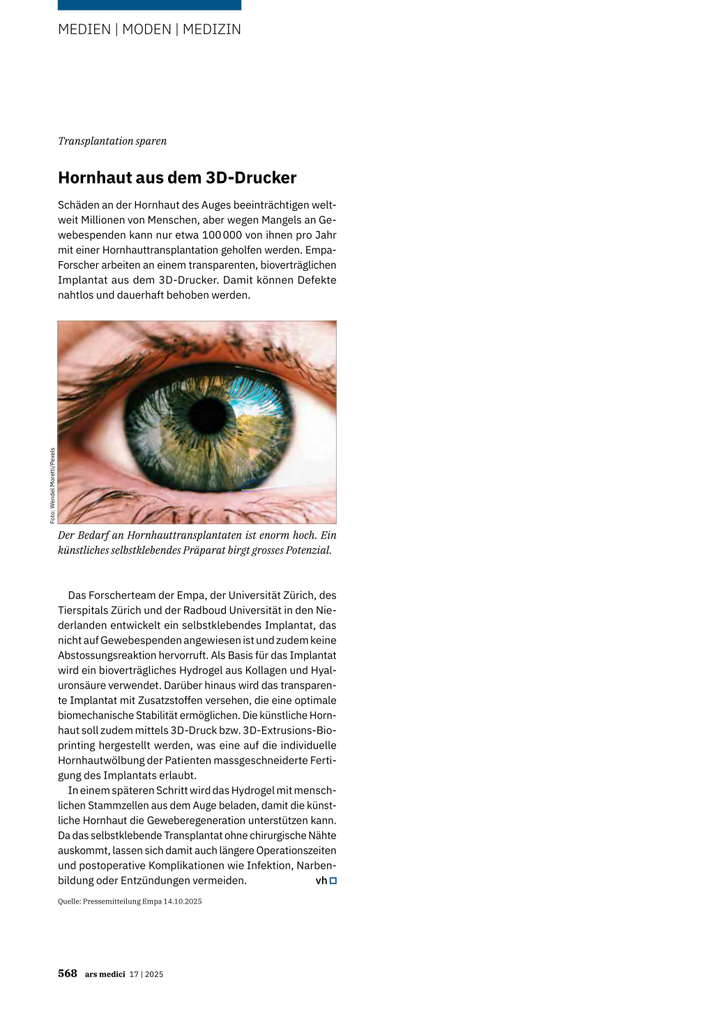 Schäden an der Hornhaut des Auges beeinträchtigen weltweit Millionen von Menschen, aber wegen Mangels an Gewebespenden kann nur etwa 100 000 von ihnen pro Jahr mit einer Hornhauttransplantation geholfen werden. EmpaForscher arbeiten an einem transparenten, bioverträglichen Implantat aus dem 3D-Drucker. Damit können Defekte nahtlos und dauerhaft behoben werden.