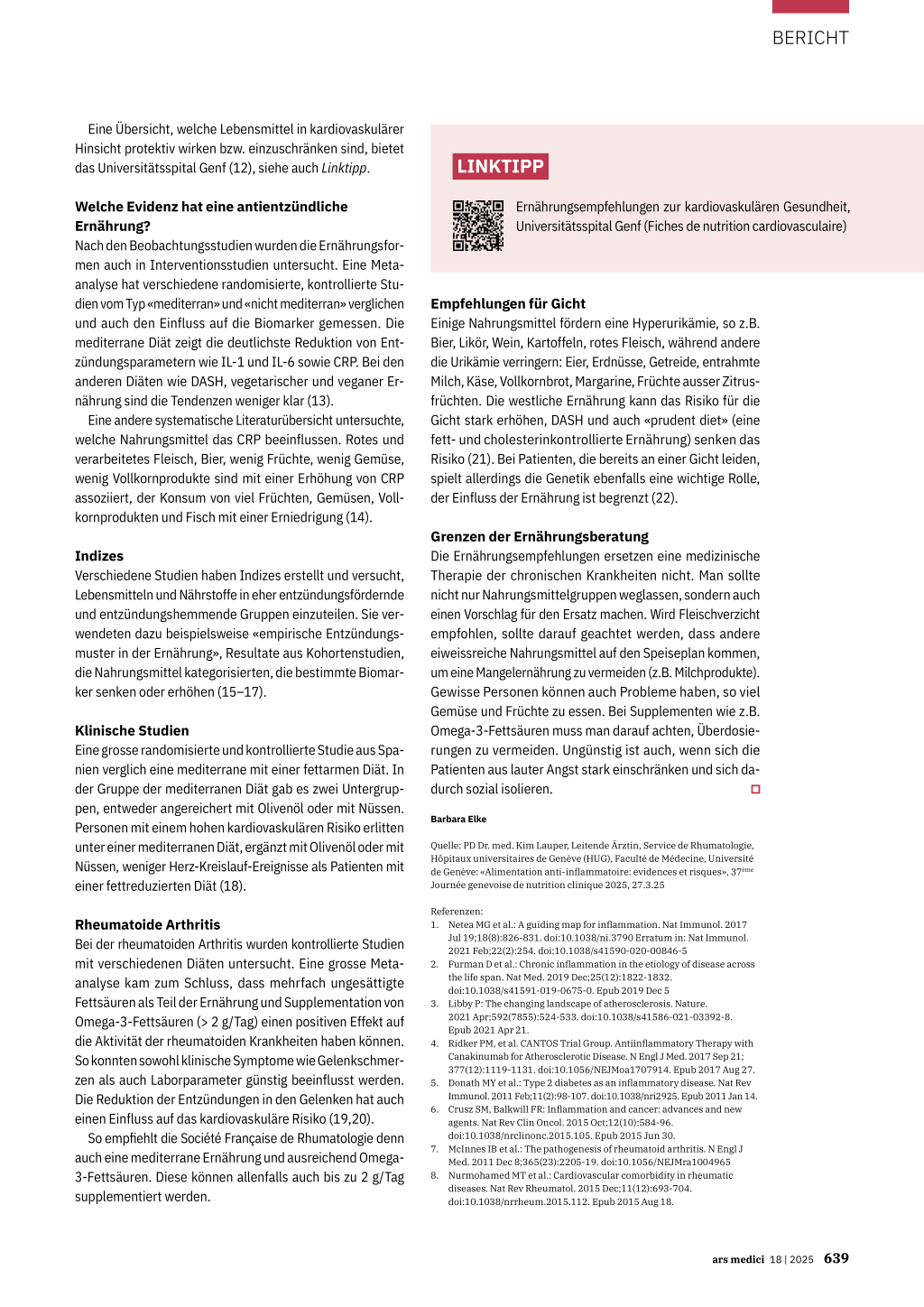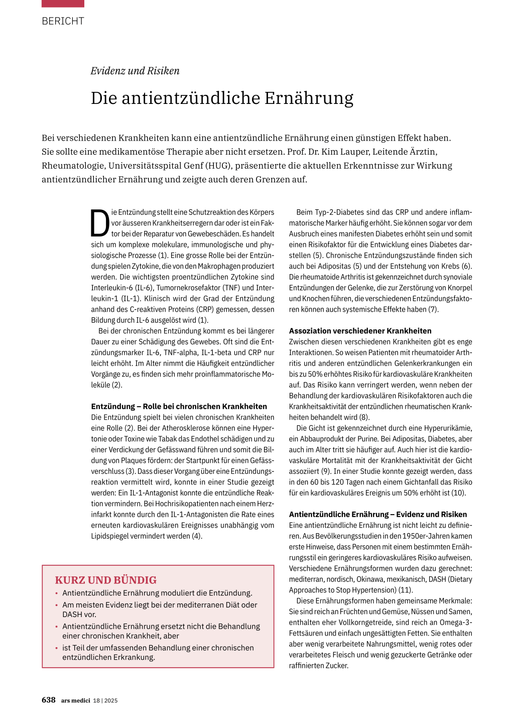 Quelle: PD Dr. med. Kim Lauper, Leitende Ärztin, Service de Rhumatologie, Hôpitaux universitaires de Genève (HUG), Faculté de Médecine, Université de Genève: «Alimentation anti-inflammatoire: evidences et risques», 37ème Journée genevoise de nutrition clinique 2025, 27.3.25