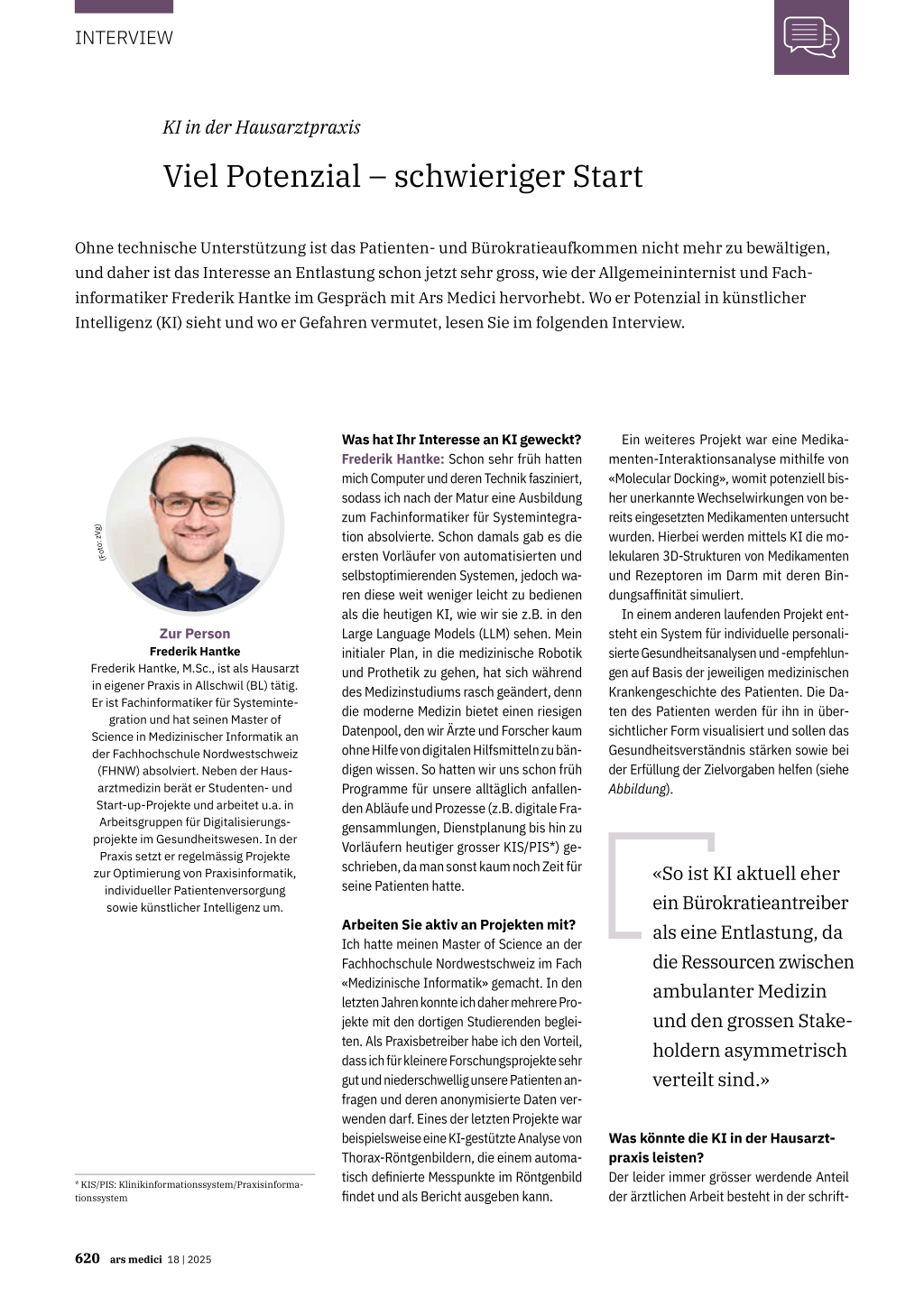 Was hat Ihr Interesse an KI geweckt? Frederik Hantke: Schon sehr früh hatten mich Computer und deren Technik fasziniert, sodass ich nach der Matur eine Ausbildung zum Fachinformatiker für Systemintegration absolvierte. Schon damals gab es die ersten Vorläufer von automatisierten und selbstoptimierenden Systemen, jedoch waren diese weit weniger leicht zu bedienen als die heutigen KI, wie wir sie z.B. in den Large Language Models (LLM) sehen. Mein initialer Plan, in die medizinische Robotik und Prothetik zu gehen, hat sich während des Medizinstudiums rasch geändert, denn die moderne Medizin bietet einen riesigen Datenpool, den wir Ärzte und Forscher kaum ohne Hilfe von digitalen Hilfsmitteln zu bändigen wissen. So hatten wir uns schon früh Programme für unsere alltäglich anfallenden Abläufe und Prozesse (z.B. digitale Fragensammlungen, Dienstplanung bis hin zu Vorläufern heutiger grosser KIS/PIS*) geschrieben, da man sonst kaum noch Zeit für seine Patienten hatte.