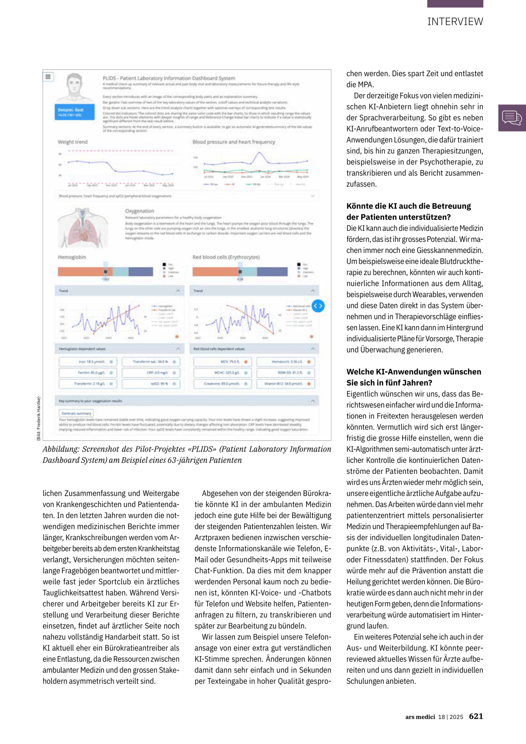 Welche KI-Anwendungen wünschen Sie sich in fünf Jahren? Eigentlich wünschen wir uns, dass das Berichtswesen einfacher wird und die Informationen in Freitexten herausgelesen werden könnten. Vermutlich wird sich erst längerfristig die grosse Hilfe einstellen, wenn die KI-Algorithmen semi-automatisch unter ärztlicher Kontrolle die kontinuierlichen Datenströme der Patienten beobachten. Damit wird es uns Ärzten wieder mehr möglich sein, unsere eigentliche ärztliche Aufgabe aufzunehmen. Das Arbeiten würde dann viel mehr patientenzentriert mittels personalisierter Medizin und Therapieempfehlungen auf Basis der individuellen longitudinalen Datenpunkte (z.B. von Aktivitäts-, Vital-, Laboroder Fitnessdaten) stattfinden. Der Fokus würde mehr auf die Prävention anstatt die Heilung gerichtet werden können. Die Bürokratie würde es dann auch nicht mehr in der heutigen Form geben, denn die Informationsverarbeitung würde automatisiert im Hintergrund laufen.