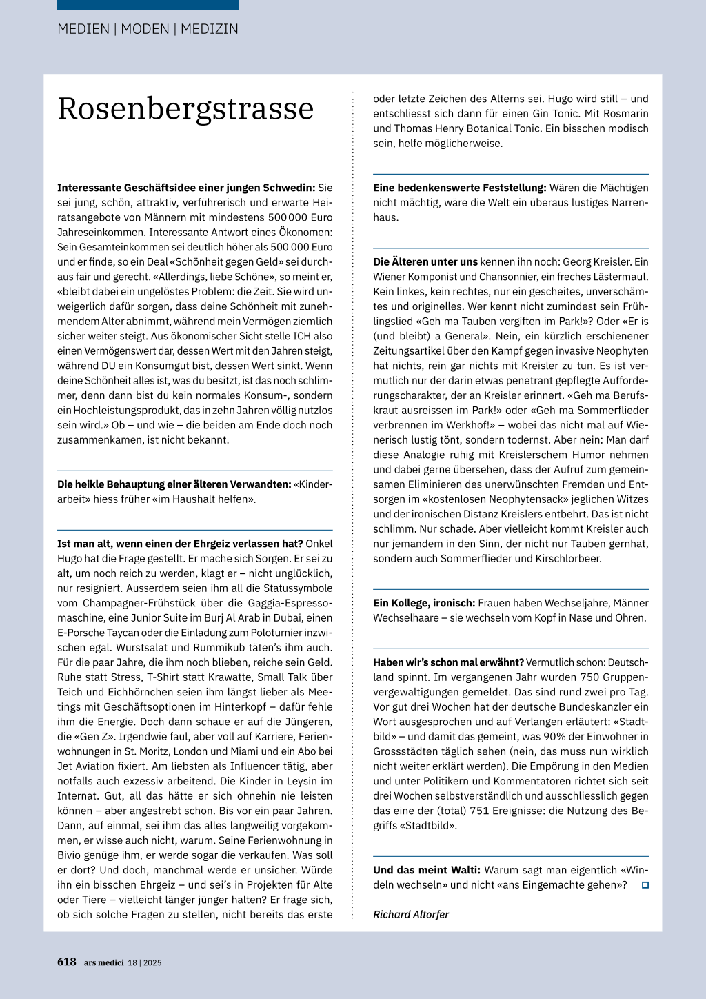 Ist man alt, wenn einen der Ehrgeiz verlassen hat? Onkel Hugo hat die Frage gestellt. Er mache sich Sorgen. Er sei zu alt, um noch reich zu werden, klagt er – nicht unglücklich, nur resigniert. Ausserdem seien ihm all die Statussymbole vom Champagner-Frühstück über die Gaggia-Espressomaschine, eine Junior Suite im Burj Al Arab in Dubai, einen E-Porsche Taycan oder die Einladung zum Poloturnier inzwischen egal. Wurstsalat und Rummikub täten’s ihm auch. Für die paar Jahre, die ihm noch blieben, reiche sein Geld. Ruhe statt Stress, T-Shirt statt Krawatte, Small Talk über Teich und Eichhörnchen seien ihm längst lieber als Meetings mit Geschäftsoptionen im Hinterkopf – dafür fehle ihm die Energie. Doch dann schaue er auf die Jüngeren, die «Gen Z». Irgendwie faul, aber voll auf Karriere, Ferienwohnungen in St. Moritz, London und Miami und ein Abo bei Jet Aviation fixiert. Am liebsten als Influencer tätig, aber notfalls auch exzessiv arbeitend. Die Kinder in Leysin im Internat. Gut, all das hätte er sich ohnehin nie leisten können – aber angestrebt schon. Bis vor ein paar Jahren. Dann, auf einmal, sei ihm das alles langweilig vorgekommen, er wisse auch nicht, warum. Seine Ferienwohnung in Bivio genüge ihm, er werde sogar die verkaufen. Was soll er dort? Und doch, manchmal werde er unsicher. Würde ihn ein bisschen Ehrgeiz – und sei’s in Projekten für Alte oder Tiere – vielleicht länger jünger halten? Er frage sich, ob sich solche Fragen zu stellen, nicht bereits das erste