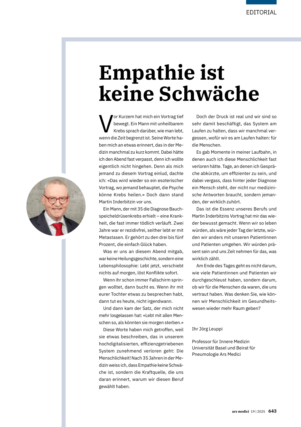 Diese Worte haben mich getroffen, weil sie etwas beschreiben, das in unserem hochdigitalisierten, effizienzgetriebenen System zunehmend verloren geht: Die Menschlichkeit! Nach 35 Jahren in der Medizin weiss ich, dass Empathie keine Schwäche ist, sondern die Kraftquelle, die uns daran erinnert, warum wir diesen Beruf gewählt haben.