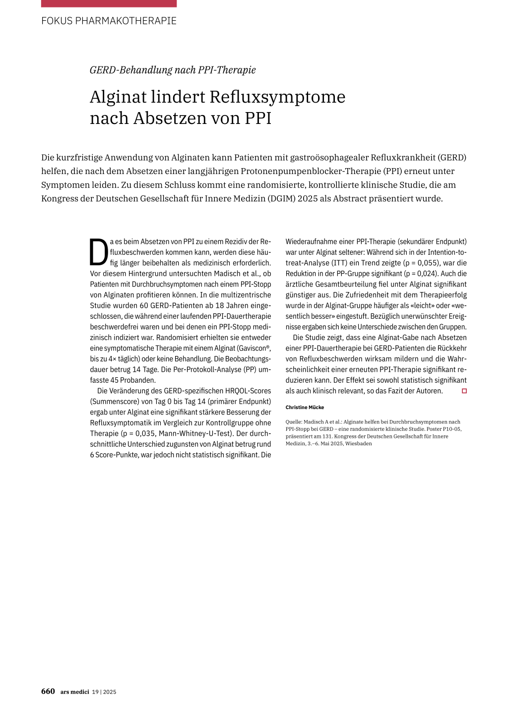 Da es beim Absetzen von PPI zu einem Rezidiv der Refluxbeschwerden kommen kann, werden diese häufig länger beibehalten als medizinisch erforderlich. Vor diesem Hintergrund untersuchten Madisch et al., ob Patienten mit Durchbruchsymptomen nach einem PPI-Stopp von Alginaten profitieren können. In die multizentrische Studie wurden 60 GERD-Patienten ab 18 Jahren eingeschlossen, die während einer laufenden PPI-Dauertherapie beschwerdefrei waren und bei denen ein PPI-Stopp medizinisch indiziert war. Randomisiert erhielten sie entweder eine symptomatische Therapie mit einem Alginat (Gaviscon®, bis zu 4× täglich) oder keine Behandlung. Die Beobachtungsdauer betrug 14 Tage. Die Per-Protokoll-Analyse (PP) umfasste 45 Probanden.