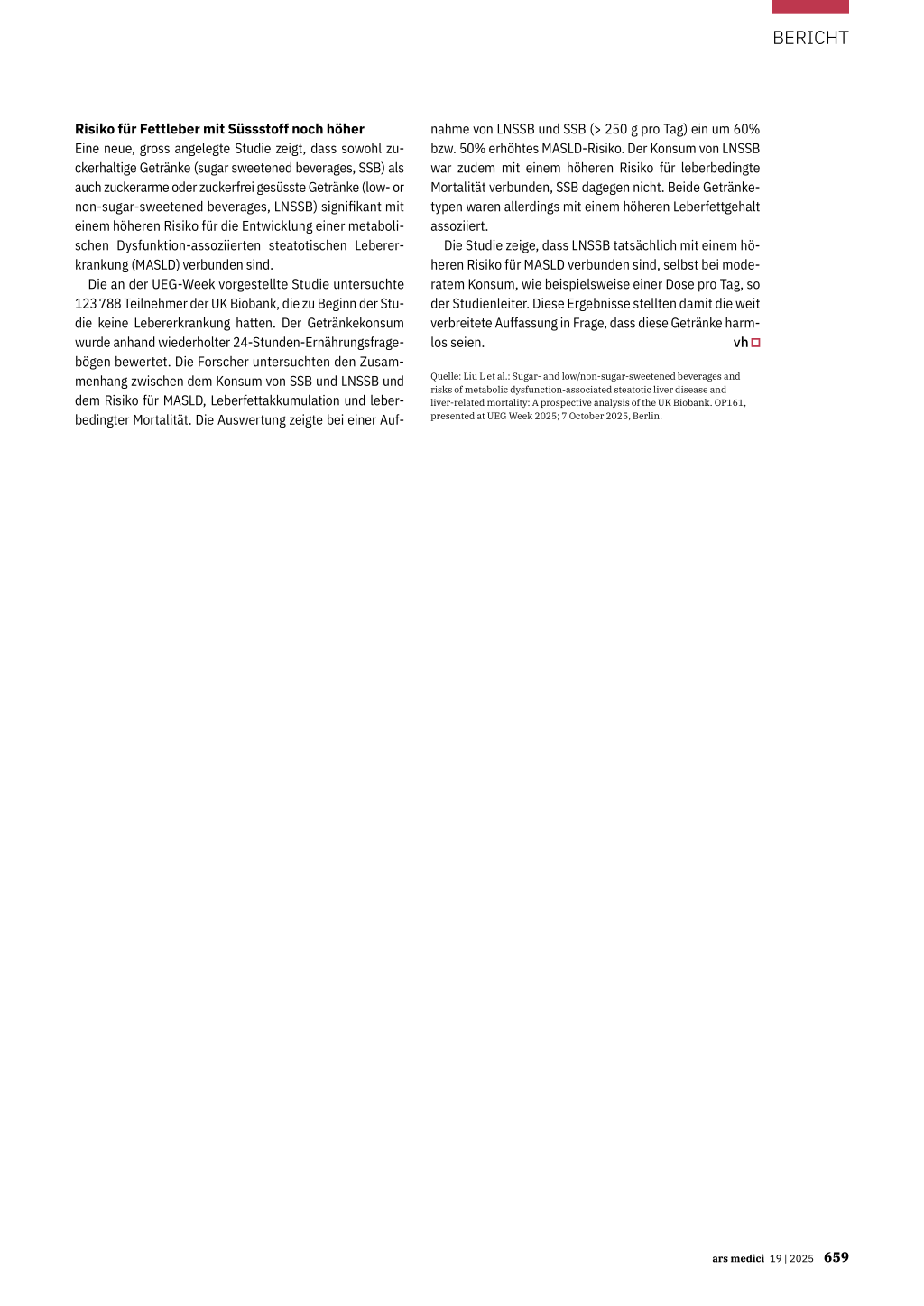 Risiko für Fettleber mit Süssstoff noch höher Eine neue, gross angelegte Studie zeigt, dass sowohl zuckerhaltige Getränke (sugar sweetened beverages, SSB) als auch zuckerarme oder zuckerfrei gesüsste Getränke (low- or non-sugar-sweetened beverages, LNSSB) signifikant mit einem höheren Risiko für die Entwicklung einer metabolischen Dysfunktion-assoziierten steatotischen Lebererkrankung (MASLD) verbunden sind.