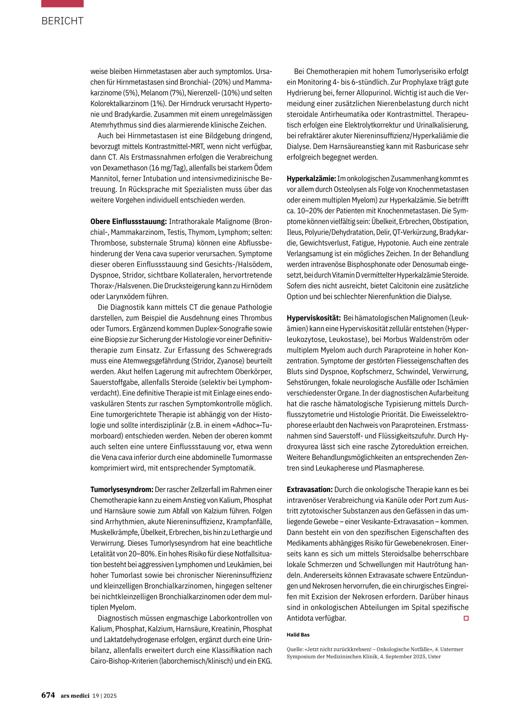 Febrile Neutropenie: Einer der häufigsten onkologischen Notfälle ist die febrile Neutropenie, bedingt durch eine onkologische Therapie z.B. mit Anthrazyklinen, Taxanen, Topoisomerasehemmern, Carboplatin, Gemcitabin, Alkylanzien und anderen Wirkstoffen, die eine Verminderung der Leukozyten hervorrufen. Mechanismus kann eine gestörte Bildung und/oder ein erhöhter Verbrauch sein. Der Abfall der absoluten Neutrophilenzahl (ANC) auf < 1000/µl erhöht das Risiko für Infektionen, bei denen sich dann oft trotz Suche im Urin oder im Thoraxröntgenbild kein Fokus finden lässt. Dies liegt unter anderem daran, dass rund 80% dieser Infekte durch endogene Erreger aus dem körpereigenen Milieu hervorgerufen werden. Als Definition gilt Fieber ≥ 38,3 °C einmalig oder ≥ 38,0 °C über mehr als eine Stunde. Kritisch wird es bei ANC < 500/µl. Wichtig ist, bei älteren Patienten oder Steroidtherapien auch an Infektionen ohne Fieber zu denken. Über die Gefahr durch eine febrile Neutropenie müssen auch die Patienten mit der Aufforderung, sich schnellstmöglich, im besten Fall innert einer Stunde, auf dem Notfall zu melden, gut aufgeklärt werden. Warnsignale (Red Flags) sind Hypotonie, gesteigerte Atemfrequenz, schlechte Sauerstoffsättigung, Schüttelfrost, septisches Bild. Eine präzisere Einschätzung der Situation erlauben Risikotools, beispielsweise der MASCC(Multinational Association for Supportive Care in Cancer)-Score. Wichtig ist auch die Kenntnis der lokalen Resistenzlage bei den Erregern. Als Diagnostik bei febriler Neutropenie sollten neben grossem Labor noch vor einer Antibiotikabehandlung zweimal Blutkulturen entnommen werden. Weitere sinnvolle Untersuchungen sind Urinstatus/Urinkultur, gegebenenfalls ein Thoraxröntgen. Der Suche nach einem Fokus gelten Überprüfung von Katheter, Zugängen/Port, Haut, Magendarm- KURZ UND BÜNDIG • Onkologische Notfälle sind oft eskalierende Krankheitsverläufe. Gefragt sind in diesen Situationen eine interdisziplinäre Diagnostik und Therapie, die am sichersten im Spital und im Team gewährleistet werden können. • In der Praxis ergibt sich eine hausärztliche Schlüsselrolle: Red Flags erkennen, rasch Rücksprache mit der Onkologie nehmen und bei Bedarf zuweisen. trakt und Lunge. Als Erstmassnahmen erfolgen intravenöse Volumensubstitution und die Verabreichung eines geeigneten Antibiotikums binnen 60 Minuten (Cefepim/PiperacillinTazobactam/Meropenem, je nach Protokoll). Bei günstiger Risikokonstellation kann eine febrile Neutropenie ambulant behandelt werden. Rückenmarkkompression: Knochenmetastasen, Epiduralmetastasen oder spinale Metastasen können eine venöse Stauung mit Ödem verursachen, die zu einer ischämischen Schädigung des Rückenmarks führen können. Dies kommt bei 1–5% aller Tumorpatienten vor und ist prognostisch ungünstig (medianes Überleben von 2–6 Monaten). Red Flags sind progredienter Rückenschmerz (therapierefraktär, bewegungsabhängig, nachts, Valsalva), auslösbar, teils radikulärer Schmerzcharakter, ferner motorische Schwäche, sensible Defizite, Blasen-/Mastdarmstörung, Hyperreflexie, Spasmus, Paraplegie. Diagnostisch ist eine Bildgebung (Standard: MRT, sonst CT) der gesamten Wirbelsäule mit Kontrastmittel dringend. Die Brustwirbelsäule ist zu 60–70% betroffen, die Lendenwirbelsäule zu 20–30%, die Halswirbelsäule zu 10%. Ursachen für Knochenmetastasen sind vor allem Mamma- (50–80%), Prostata- (50–80%) und Lungenkarzinome (30–50%), ferner Nierenzellkarzinome (20–50%), Urothelkarzinome (10–40%), seltener Rektumkarzinome (8–15%) sowie Non-HodgkinLymphome und multiple Myelome (5–10%). Als Erstmassnahme gilt die Verabreichung von Dexamethason (z.B. 16 mg/Tag) mit Bettruhe/Immobilisation und schneller Rücksprache mit Neurochirurgie, Radioonkologie, Onkologie, Neurologie. Im Weiteren muss eine multimodale Therapie erfolgen mit Radiotherapie und/oder chirurgischer Dekompression in Abhängigkeit von Stabilität, Prognose und Histologie. Weitere Optionen sind spezifische Systemtherapien und Antiresorptiva. Hirnmetastasen: Die Symptome sind abhängig von Lokalisation, Grösse und Wachstumsgeschwindigkeit der verursachenden Hirnmetastasen und bestehen in Kopfschmerz, Übelkeit, Krampfanfällen, neurologischen Defiziten, Seh-, Hör-, Sprechstörungen, Merkstörungen, Müdigkeit bis Somnolenz, Wesensveränderungen bei Frontalhirnbefall, Gleichgewichts- und Koordinationsstörungen bei Kleinhirnbefall. T eil- ars medici 19 | 2025 673 BERICHT weise bleiben Hirnmetastasen aber auch symptomlos. Ursachen für Hirnmetastasen sind Bronchial- (20%) und Mammakarzinome (5%), Melanom (7%), Nierenzell- (10%) und selten Kolorektalkarzinom (1%). Der Hirndruck verursacht Hypertonie und Bradykardie. Zusammen mit einem unregelmässigen Atemrhythmus sind dies alarmierende klinische Zeichen. Auch bei Hirnmetastasen ist eine Bildgebung dringend, bevorzugt mittels Kontrastmittel-MRT, wenn nicht verfügbar, dann CT. Als Erstmassnahmen erfolgen die Verabreichung von Dexamethason (16 mg/Tag), allenfalls bei starkem Ödem Mannitol, ferner Intubation und intensivmedizinische Betreuung. In Rücksprache mit Spezialisten muss über das weitere Vorgehen individuell entschieden werden. Obere Einflussstauung: Intrathorakale Malignome (Bronchial-, Mammakarzinom, Testis, Thymom, Lymphom; selten: Thrombose, substernale Struma) können eine Abflussbehinderung der Vena cava superior verursachen. Symptome dieser oberen Einflussstauung sind Gesichts-/Halsödem, Dyspnoe, Stridor, sichtbare Kollateralen, hervortretende Thorax-/Halsvenen. Die Drucksteigerung kann zu Hirnödem oder Larynxödem führen. Die Diagnostik kann mittels CT die genaue Pathologie darstellen, zum Beispiel die Ausdehnung eines Thrombus oder Tumors. Ergänzend kommen Duplex-Sonografie sowie eine Biopsie zur Sicherung der Histologie vor einer Definitivtherapie zum Einsatz. Zur Erfassung des Schweregrads muss eine Atemwegsgefährdung (Stridor, Zyanose) beurteilt wer