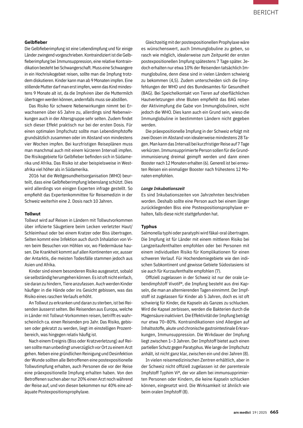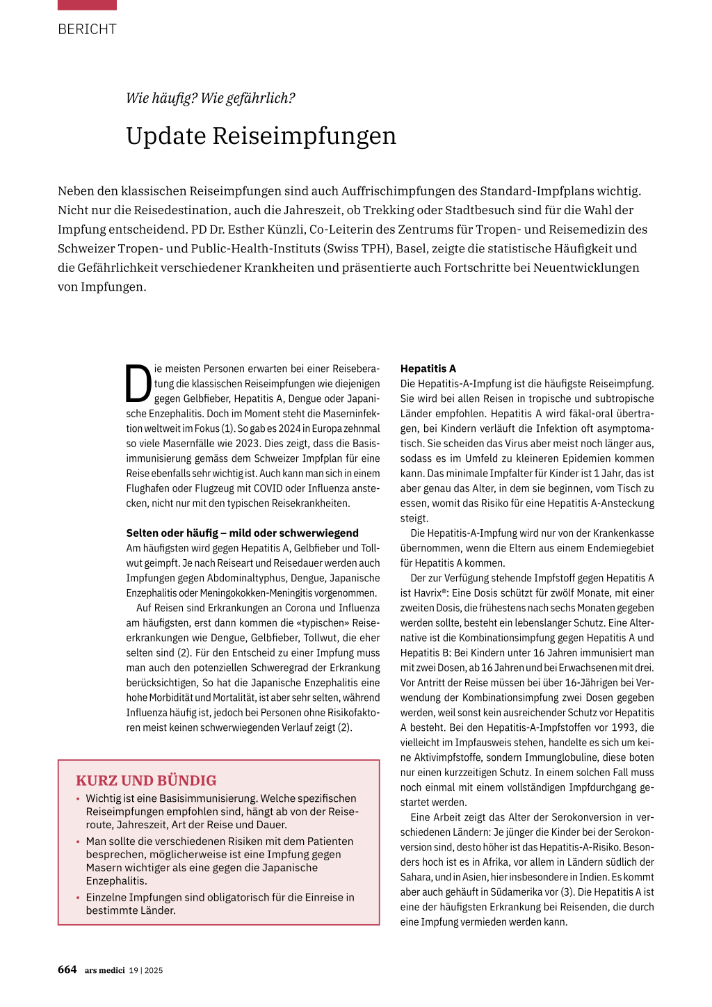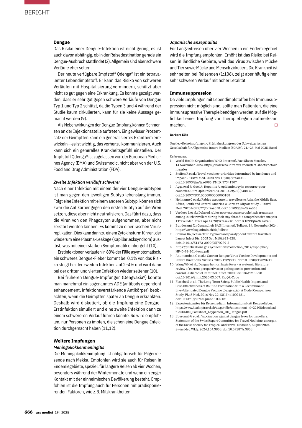 14 November 2024. https://www.who.int/news-room/fact-sheets/detail/ measles 2. Steffen R et al.: Travel vaccines-priorities determined by incidence and impact. J Travel Med. 2023 Nov 18;30(7):taad085. doi:10.1093/jtm/taad085. PMID: 37341307 3. Aggarwal R, Goel A: Hepatitis A: epidemiology in resource-poor countries. Curr Opin Infect Dis. 2015 Oct;28(5):488-496. doi:10.1097/QCO.0000000000000188 4. Heitkamp C et al.: Rabies exposure in travellers to Asia, the Middle East, Africa, South and Central America-a German Airport study. J Travel Med. 2020 Nov 9;27(7):taaa058. doi:10.1093/jtm/taaa058 5. Verdoes L et al.: Delayed rabies post-exposure prophylaxis treatment among Dutch travellers during their stay abroad: a comprehensive analysis. J Travel Med. 2021 Apr 14;28(3):taaa240. doi:10.1093/jtm/taaa240 6. Bundesamt für Gesundheit BAG [Internet]. Tollwut. 14. November 2024. https://www.bag.admin.ch/de/tollwut 7. Connor BA, Schwartz E: Typhoid and paratyphoid fever in travellers. Lancet Infect Dis. 2005 Oct;5(10):623-628. doi:10.1016/S1473-3099(05)70239-5 8. https://publications.gc.ca/collections/collection_2014/aspc-phac/ HP40-98-2014-eng.pdf 9. Anumanthan G et al.: Current Dengue Virus Vaccine Developments and Future Directions. Viruses. 2025;17(2):212. doi:10.3390/v17020212 10. Wang WH et al.: Dengue hemorrhagic fever - A systemic literature review of current perspectives on pathogenesis, prevention and control. J Microbiol Immunol Infect. 2020 Dec;53(6):963-978. doi:10.1016/j.jmii.2020.03.007. Ev. QR-Code 11. Flasche S et al.: The Long-Term Safety, Public Health Impact, and Cost-Effectiveness of Routine Vaccination with a Recombinant, Live-Attenuated Dengue Vaccine (Dengvaxia): A Model Comparison Study. PLoS Med. 2016 Nov 29;13(11):e1002181. doi:10.1371/journal.pmed.1002181 12. Expertenkomitee für Reisemedizin: Informationsblatt Denguefieber. https://www.healthytravel.ch/de/get-file?attachment_id=2210&download_­ file=EKRM_Factsheet_Layperson_DE_Dengue.pdf 13. Eperonab G et al.: Vaccination against dengue fever for travellers: Statement of the Swiss Expert Committee for Travel Medicine, an organ of the Swiss Society for Tropical and Travel Medicine, August 2024. Swiss Med Wkly. 2024;154:3858. doi:10.57187/s.3858