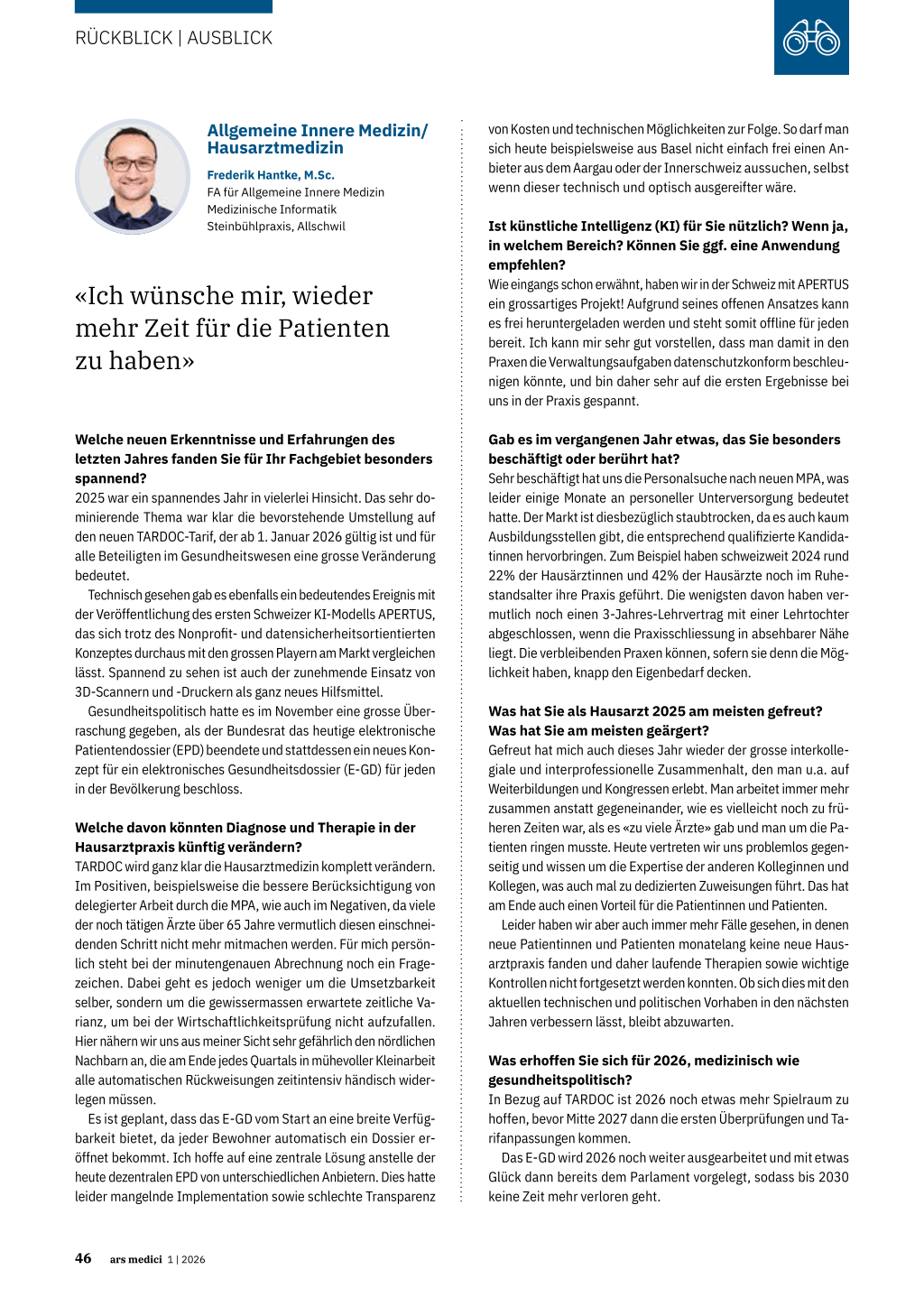 Welche neuen Erkenntnisse und Erfahrungen des letzten Jahres fanden Sie für Ihr Fachgebiet besonders spannend? 2025 war ein spannendes Jahr in vielerlei Hinsicht. Das sehr dominierende Thema war klar die bevorstehende Umstellung auf den neuen TARDOC-Tarif, der ab 1. Januar 2026 gültig ist und für alle Beteiligten im Gesundheitswesen eine grosse Veränderung bedeutet.
