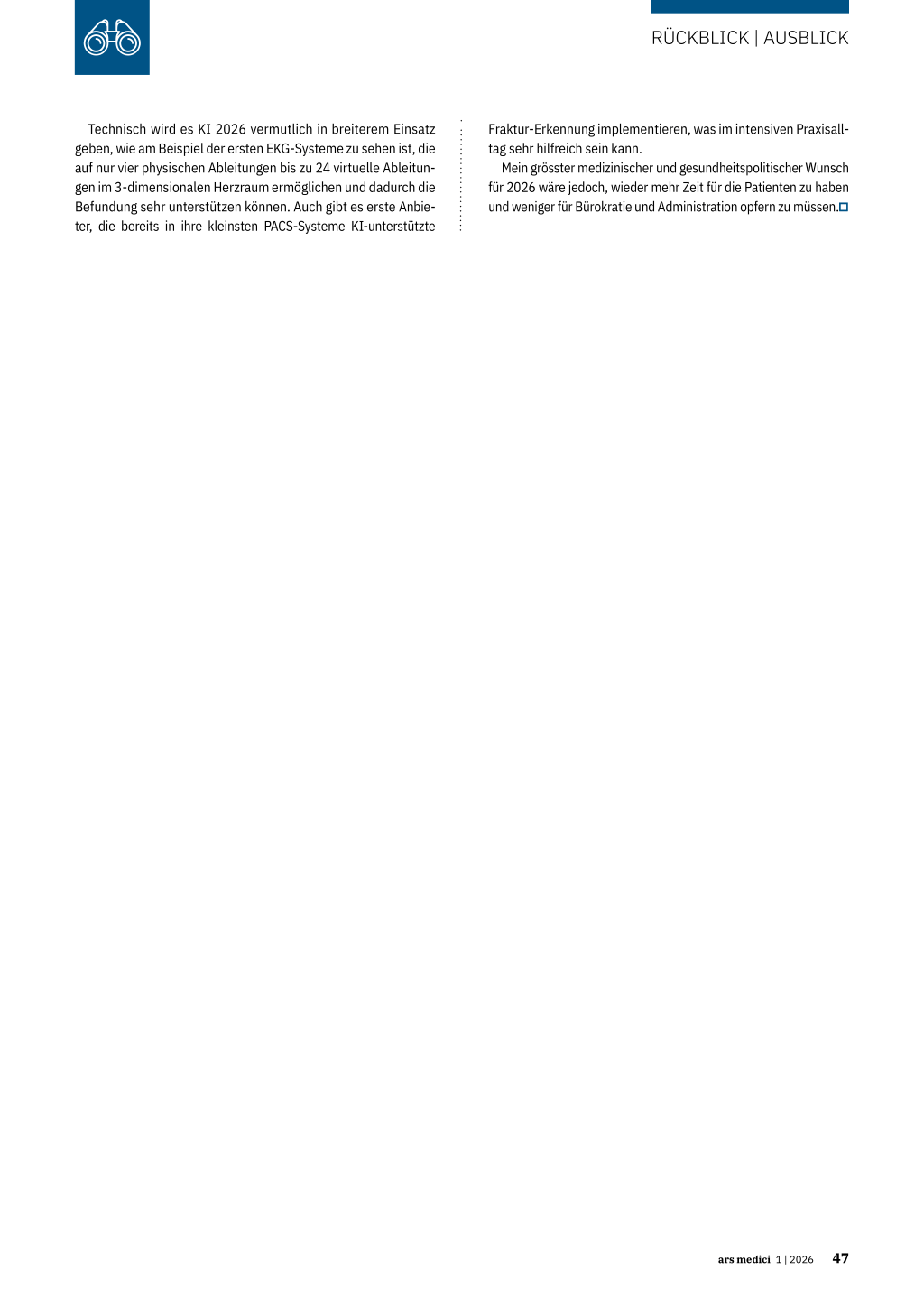 Mein grösster medizinischer und gesundheitspolitischer Wunsch für 2026 wäre jedoch, wieder mehr Zeit für die Patienten zu haben und weniger für Bürokratie und Administration opfern zu müssen.