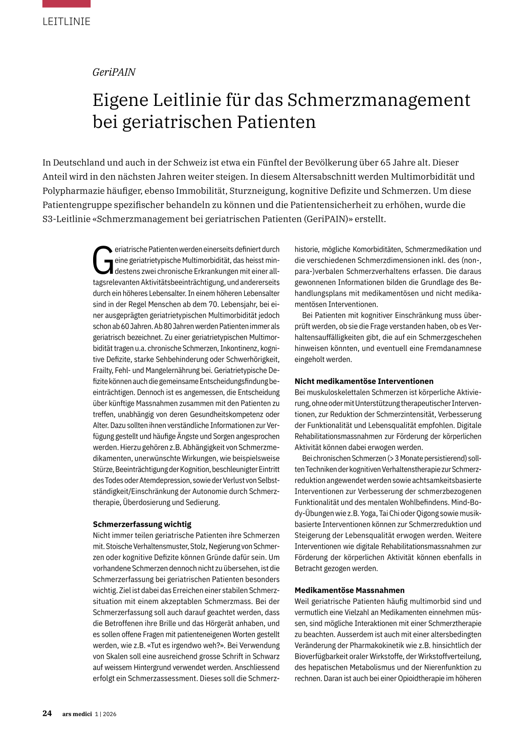 In Deutschland und auch in der Schweiz ist etwa ein Fünftel der Bevölkerung über 65 Jahre alt. Dieser Anteil wird in den nächsten Jahren weiter steigen. In diesem Altersabschnitt werden Multimorbidität und Polypharmazie häufiger, ebenso Immobilität, Sturzneigung, kognitive Defizite und Schmerzen. Um diese Patientengruppe spezifischer behandeln zu können und die Patientensicherheit zu erhöhen, wurde die S3-Leitlinie «Schmerzmanagement bei geriatrischen Patienten (GeriPAIN)» erstellt.