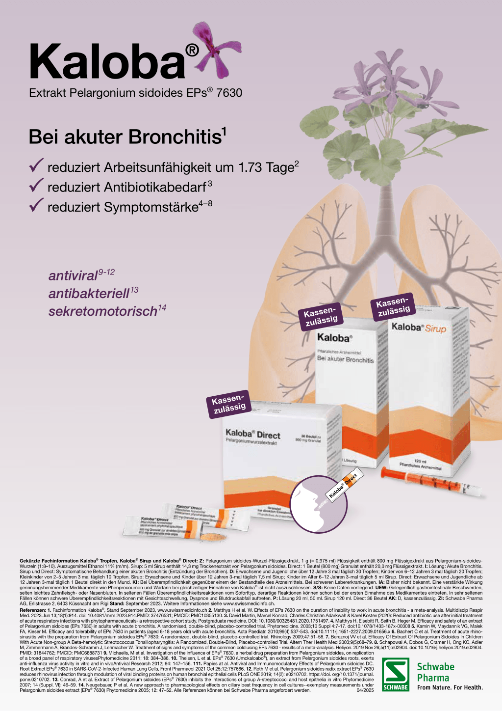 Referenzen: 1. Fachinformation Kaloba®, Stand September 2023, www.swissmedicinfo.ch 2. Matthys H et al. W. Effects of EPs 7630 on the duration of inability to work in acute bronchitis - a meta-analysis. Multidiscip Respir