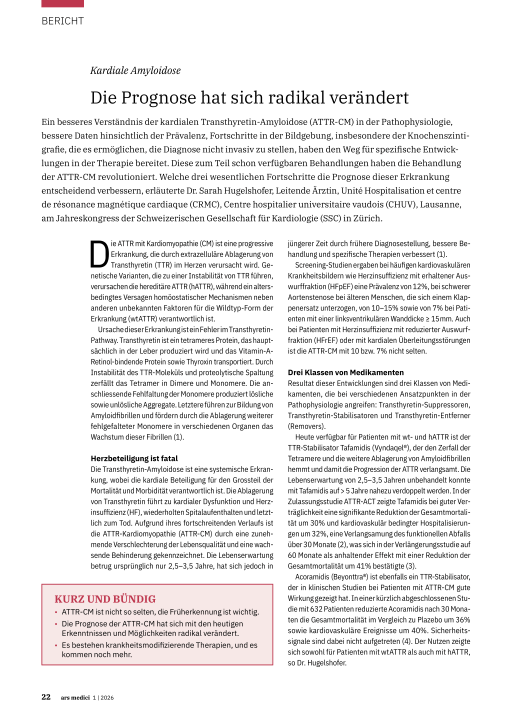 Wichtige Fragen noch offen Vor dem Hintergrund, dass das Forschungsinteresse an der ATTR-CM noch jung ist, gibt es noch einige wichtige Fragen zur Therapie zu klären: Beispielsweise mit welchem Medikament in Zukunft die Therapie begonnen werden soll sowie ob und welche Kombination sinnvoll sein kann, wie die Therapie überwacht werden soll, wie finanziert und ob noch asymptomatische Patienten wegen der vermutlich besseren Prognose bereits therapiert werden sollen. Zudem ist die optimale Herzinsuffizienztherapie bei Patienten mit ATTR-CM unklar, ebenso die Langzeitsicherheit einer TTR-Depletion. Wichtig ist auch die Frage, ob die Studienresultate «tel quel» auf Frauen übertragen werden können, zumal an den Studien überwiegend männliche Teilnehmer beteiligt waren.