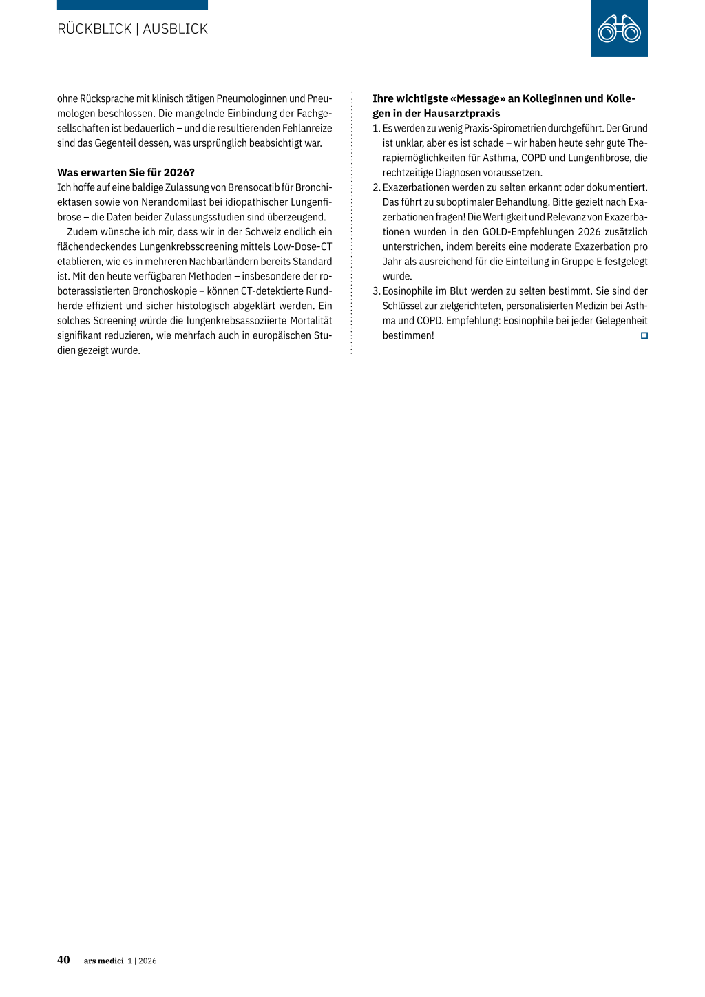 ist unklar, aber es ist schade – wir haben heute sehr gute Therapiemöglichkeiten für Asthma, COPD und Lungenfibrose, die rechtzeitige Diagnosen voraussetzen. 2. Exazerbationen werden zu selten erkannt oder dokumentiert. Das führt zu suboptimaler Behandlung. Bitte gezielt nach Exazerbationen fragen! Die Wertigkeit und Relevanz von Exazerbationen wurden in den GOLD-Empfehlungen 2026 zusätzlich unterstrichen, indem bereits eine moderate Exazerbation pro Jahr als ausreichend für die Einteilung in Gruppe E festgelegt wurde. 3. Eosinophile im Blut werden zu selten bestimmt. Sie sind der Schlüssel zur zielgerichteten, personalisierten Medizin bei Asthma und COPD. Empfehlung: Eosinophile bei jeder Gelegenheit bestimmen!