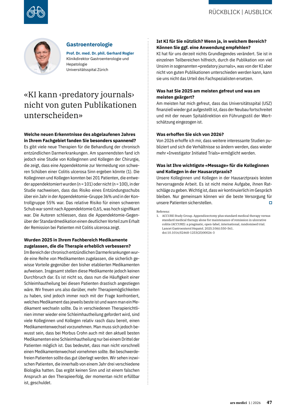 Was erhoffen Sie sich von 2026? Von 2026 erhoffe ich mir, dass weitere interessante Studien pu bliziert und sich die Verhältnisse so ändern werden, dass wieder mehr «Investigator Initiated Trials» ermöglicht werden.