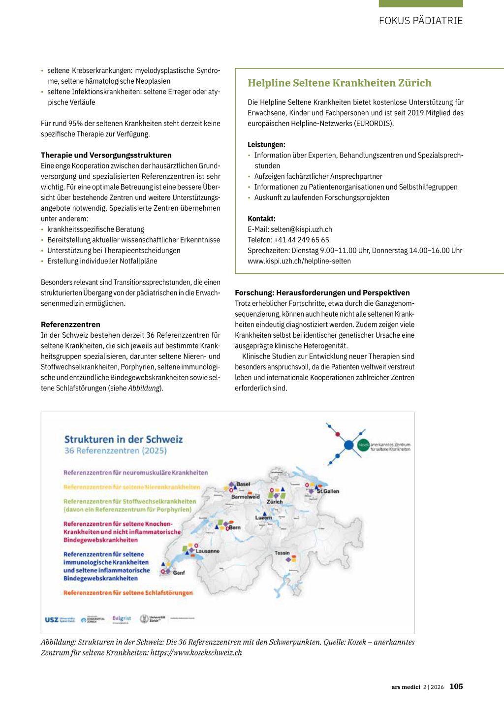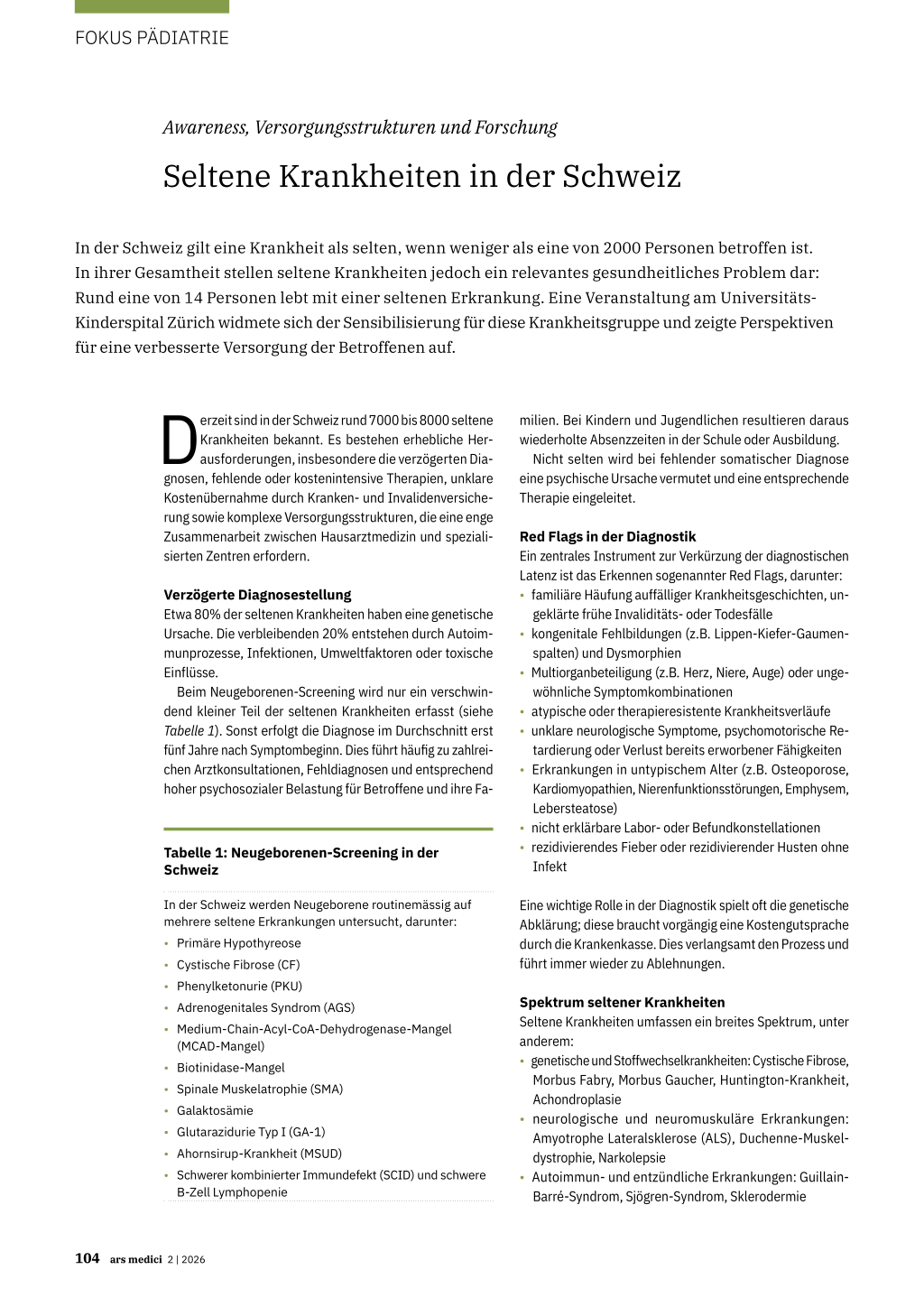 Derzeit sind in der Schweiz rund 7000 bis 8000 seltene Krankheiten bekannt. Es bestehen erhebliche Her ausforderungen, insbesondere die verzögerten Dia gnosen, fehlende oder kostenintensive Therapien, unklare Kostenübernahme durch Kranken- und Invalidenversiche rung sowie komplexe Versorgungsstrukturen, die eine enge Zusammenarbeit zwischen Hausarztmedizin und speziali sierten Zentren erfordern.