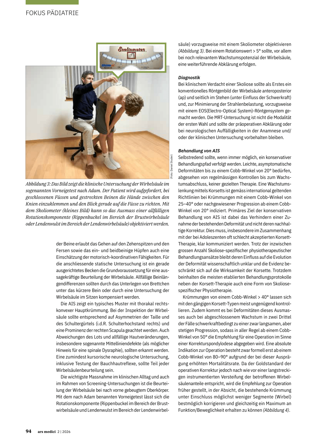 säule) vorzugsweise mit einem Skoliometer objektivieren (Abbildung 3). Bei einem Rotationswert > 5° sollte, vor allem bei noch relevantem Wachstumspotenzial der Wirbelsäule, eine weiterführende Abklärung erfolgen.