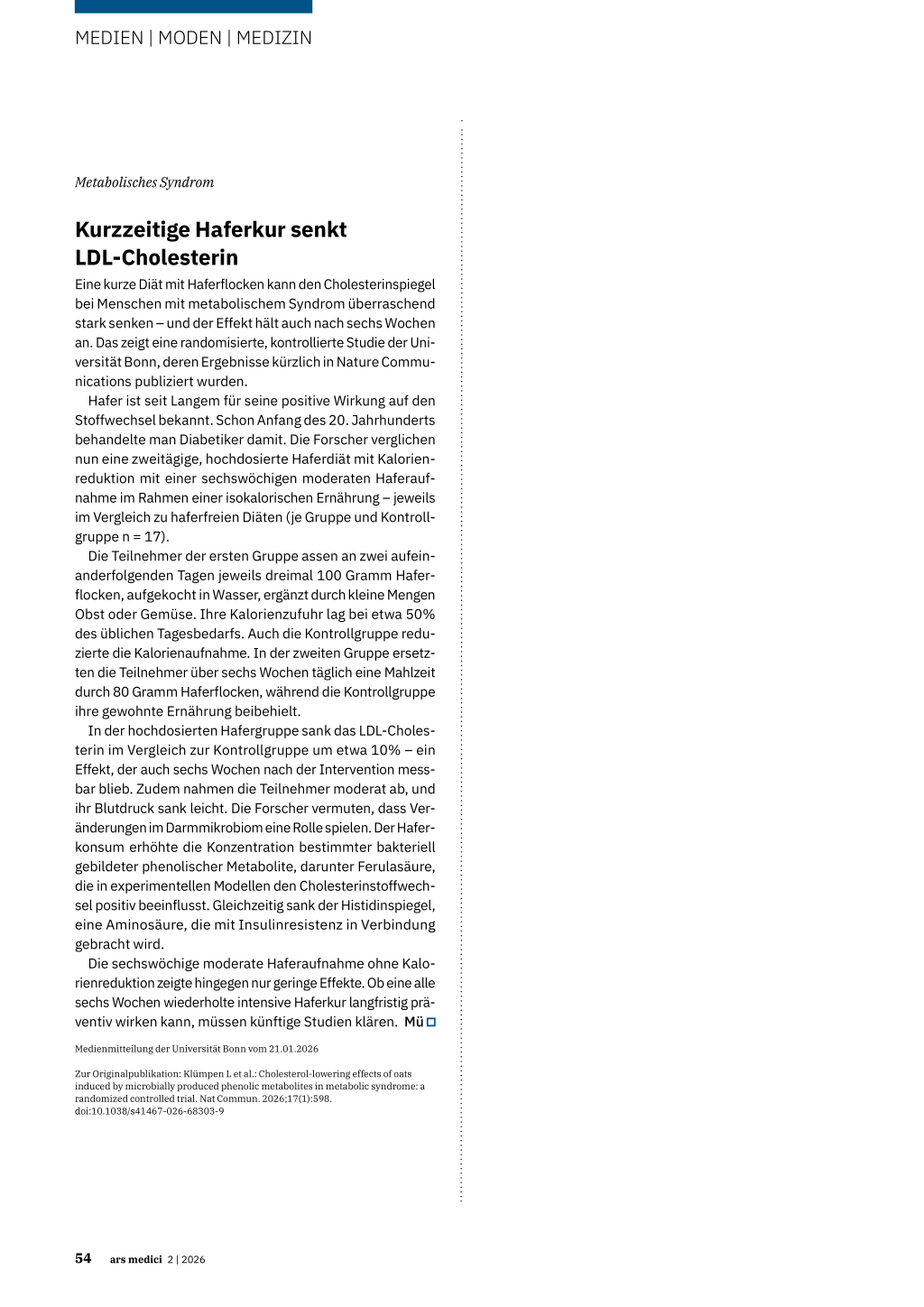 Zur Originalpublikation: Klümpen L et al.: Cholesterol-lowering effects of oats induced by microbially produced phenolic metabolites in metabolic syndrome: a randomized controlled trial. Nat Commun. 2026;17(1):598. doi:10.1038/s41467-026-68303-9