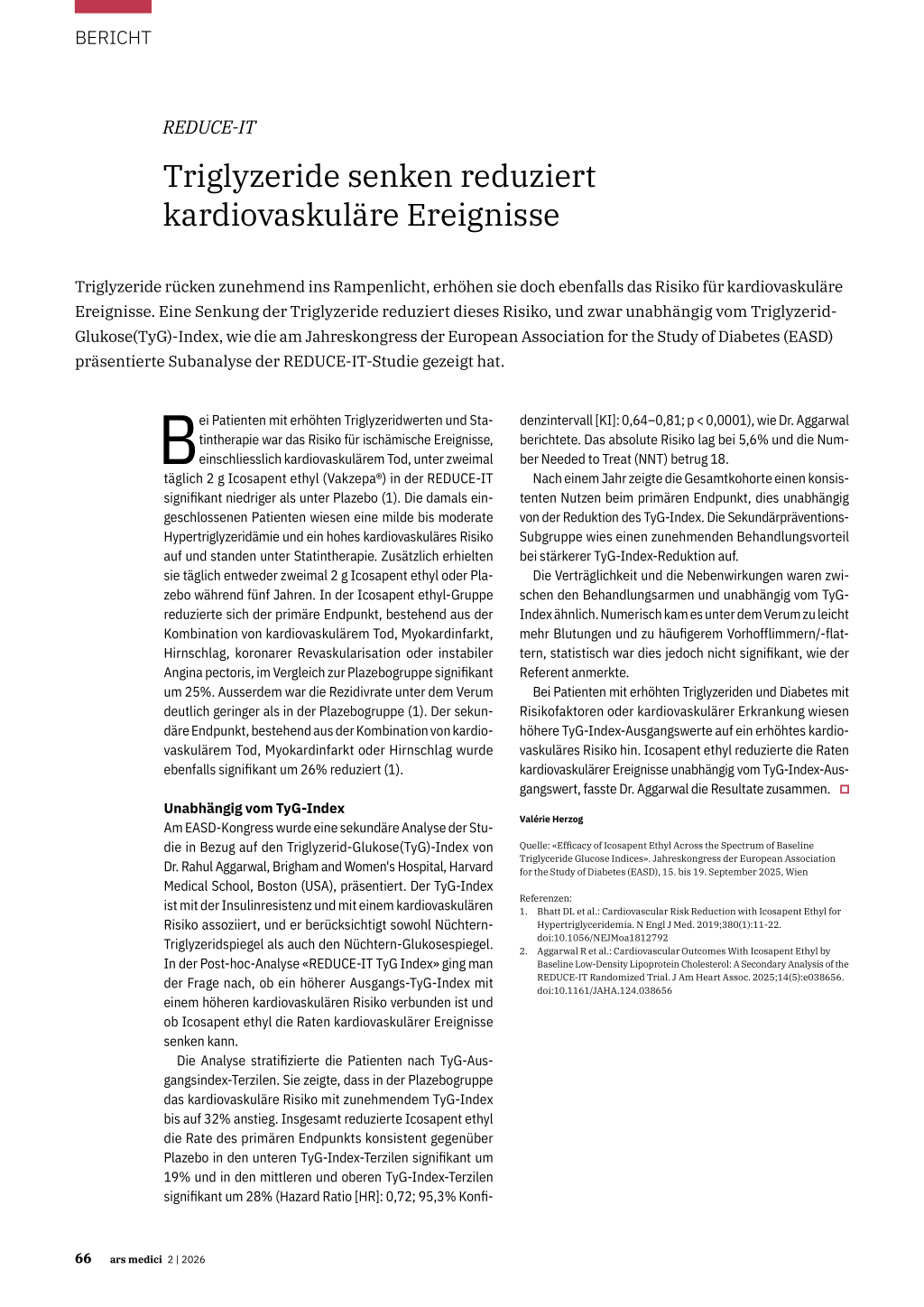 denzintervall [KI]: 0,64–0,81; p < 0,0001), wie Dr. Aggarwal berichtete. Das absolute Risiko lag bei 5,6% und die Number Needed to Treat (NNT) betrug 18. Nach einem Jahr zeigte die Gesamtkohorte einen konsistenten Nutzen beim primären Endpunkt, dies unabhängig von der Reduktion des TyG-Index. Die Sekundärpräventions- Subgruppe wies einen zunehmenden Behandlungsvorteil bei stärkerer TyG-Index-Reduktion auf. Die Verträglichkeit und die Nebenwirkungen waren zwischen den Behandlungsarmen und unabhängig vom TyGIndex ähnlich. Numerisch kam es unter dem Verum zu leicht mehr Blutungen und zu häufigerem Vorhofflimmern/-flattern, statistisch war dies jedoch nicht signifikant, wie der Referent anmerkte. Bei Patienten mit erhöhten Triglyzeriden und Diabetes mit Risikofaktoren oder kardiovaskulärer Erkrankung wiesen höhere TyG-Index-Ausgangswerte auf ein erhöhtes kardiovaskuläres Risiko hin. Icosapent ethyl reduzierte die Raten kardiovaskulärer Ereignisse unabhängig vom TyG-Index-Ausgangswert, fasste Dr. Aggarwal die Resultate zusammen. Valérie Herzog Quelle: «Efficacy of Icosapent Ethyl Across the Spectrum of Baseline Triglyceride Glucose Indices». Jahreskongress der European Association for the Study of Diabetes (EASD), 15. bis 19. September 2025, Wien Referenzen: 1. Bhatt DL et al.: Cardiovascular Risk Reduction with Icosapent Ethyl for Hypertriglyceridemia. N Engl J Med. 2019;380(1):11-22. doi:10.1056/NEJMoa1812792 2. Aggarwal R et al.: Cardiovascular Outcomes With Icosapent Ethyl by Baseline Low-Density Lipoprotein Cholesterol: A Secondary Analysis of the REDUCE-IT Randomized Trial. J Am Heart Assoc. 2025;14(5):e038656. doi:10.1161/JAHA.124.038656 66 ars medici 2 | 2026