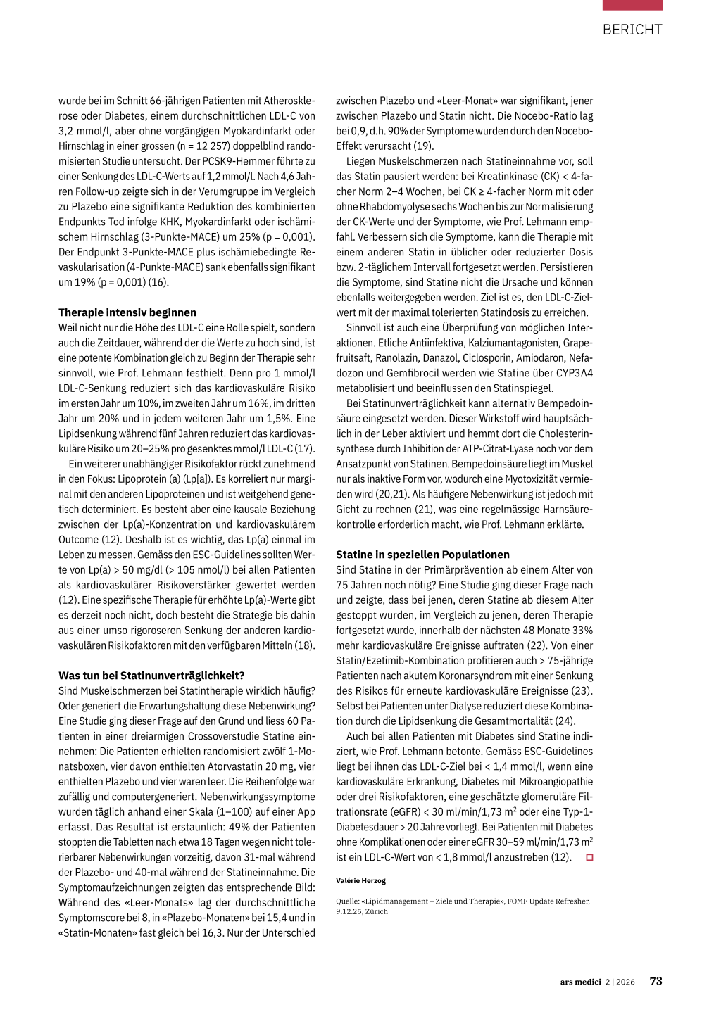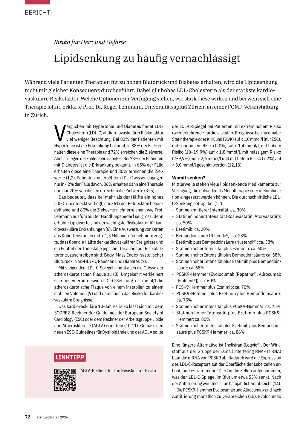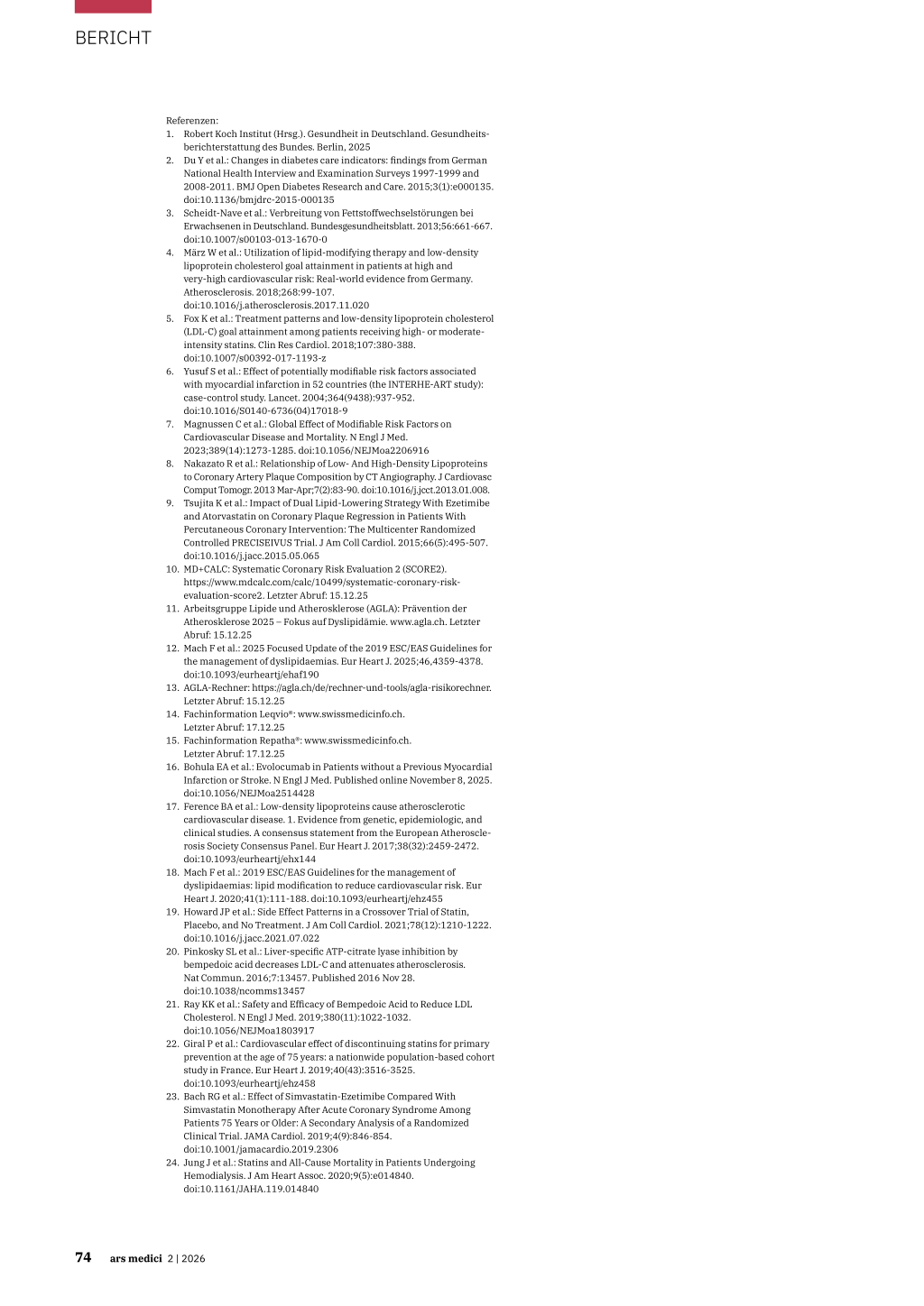 National Health Interview and Examination Surveys 1997-1999 and 2008-2011. BMJ Open Diabetes Research and Care. 2015;3(1):e000135. doi:10.1136/bmjdrc-2015-000135 3. Scheidt-Nave et al.: Verbreitung von Fettstoffwechselstörungen bei Erwachsenen in Deutschland. Bundesgesundheitsblatt. 2013;56:661-667. doi:10.1007/s00103-013-1670-0 4. März W et al.: Utilization of lipid-modifying therapy and low-density lipoprotein cholesterol goal attainment in patients at high and very-high cardiovascular risk: Real-world evidence from Germany. Atherosclerosis. 2018;268:99-107. doi:10.1016/j.atherosclerosis.2017.11.020 5. Fox K et al.: Treatment patterns and low-density lipoprotein cholesterol (LDL-C) goal attainment among patients receiving high- or moderateintensity statins. Clin Res Cardiol. 2018;107:380-388. doi:10.1007/s00392-017-1193-z 6. Yusuf S et al.: Effect of potentially modifiable risk factors associated with myocardial infarction in 52 countries (the INTERHE-ART study): case-control study. Lancet. 2004;364(9438):937-952. doi:10.1016/S0140-6736(04)17018-9 7. Magnussen C et al.: Global Effect of Modifiable Risk Factors on Cardiovascular Disease and Mortality. N Engl J Med. 2023;389(14):1273-1285. doi:10.1056/NEJMoa2206916 8. Nakazato R et al.: Relationship of Low- And High-Density Lipoproteins to Coronary Artery Plaque Composition by CT Angiography. J Cardiovasc Comput Tomogr. 2013 Mar-Apr;7(2):83-90. doi:10.1016/j.jcct.2013.01.008. 9. Tsujita K et al.: Impact of Dual Lipid-Lowering Strategy With Ezetimibe and Atorvastatin on Coronary Plaque Regression in Patients With Percutaneous Coronary Intervention: The Multicenter Randomized Controlled PRECISEIVUS Trial. J Am Coll Cardiol. 2015;66(5):495-507. doi:10.1016/j.jacc.2015.05.065 10. MD+CALC: Systematic Coronary Risk Evaluation 2 (SCORE2). https://www.mdcalc.com/calc/10499/systematic-coronary-risk- evaluation-score2. Letzter Abruf: 15.12.25 11. Arbeitsgruppe Lipide und Atherosklerose (AGLA): Prävention der Atherosklerose 2025 – Fokus auf Dyslipidämie. www.agla.ch. Letzter Abruf: 15.12.25 12. Mach F et al.: 2025 Focused Update of the 2019 ESC/EAS Guidelines for the management of dyslipidaemias. Eur Heart J. 2025;46,4359-4378. doi:10.1093/eurheartj/ehaf190 13. AGLA-Rechner: https://agla.ch/de/rechner-und-tools/agla-risikorechner. Letzter Abruf: 15.12.25 14. Fachinformation Leqvio®: www.swissmedicinfo.ch. Letzter Abruf: 17.12.25 15. Fachinformation Repatha®: www.swissmedicinfo.ch. Letzter Abruf: 17.12.25 16. Bohula EA et al.: Evolocumab in Patients without a Previous Myocardial Infarction or Stroke. N Engl J Med. Published online November 8, 2025. doi:10.1056/NEJMoa2514428 17. Ference BA et al.: Low-density lipoproteins cause atherosclerotic cardiovascular disease. 1. Evidence from genetic, epidemiologic, and clinical studies. A consensus statement from the European Atherosclerosis Society Consensus Panel. Eur Heart J. 2017;38(32):2459-2472. doi:10.1093/eurheartj/ehx144 18. Mach F et al.: 2019 ESC/EAS Guidelines for the management of dyslipidaemias: lipid modification to reduce cardiovascular risk. Eur Heart J. 2020;41(1):111-188. doi:10.1093/eurheartj/ehz455 19. Howard JP et al.: Side Effect Patterns in a Crossover Trial of Statin, Placebo, and No Treatment. J Am Coll Cardiol. 2021;78(12):1210-1222. doi:10.1016/j.jacc.2021.07.022 20. Pinkosky SL et al.: Liver-specific ATP-citrate lyase inhibition by bempedoic acid decreases LDL-C and attenuates atherosclerosis. Nat Commun. 2016;7:13457. Published 2016 Nov 28. doi:10.1038/ncomms13457 21. Ray KK et al.: Safety and Efficacy of Bempedoic Acid to Reduce LDL Cholesterol. N Engl J Med. 2019;380(11):1022-1032. doi:10.1056/NEJMoa1803917 22. Giral P et al.: Cardiovascular effect of discontinuing statins for primary prevention at the age of 75 years: a nationwide population-based cohort study in France. Eur Heart J. 2019;40(43):3516-3525. doi:10.1093/eurheartj/ehz458 23. Bach RG et al.: Effect of Simvastatin-Ezetimibe Compared With Simvastatin Monotherapy After Acute Coronary Syndrome Among Patients 75 Years or Older: A Secondary Analysis of a Randomized Clinical Trial. JAMA Cardiol. 2019;4(9):846-854. doi:10.1001/jamacardio.2019.2306 24. Jung J et al.: Statins and All-Cause Mortality in Patients Undergoing Hemodialysis. J Am Heart Assoc. 2020;9(5):e014840. doi:10.1161/JAHA.119.014840