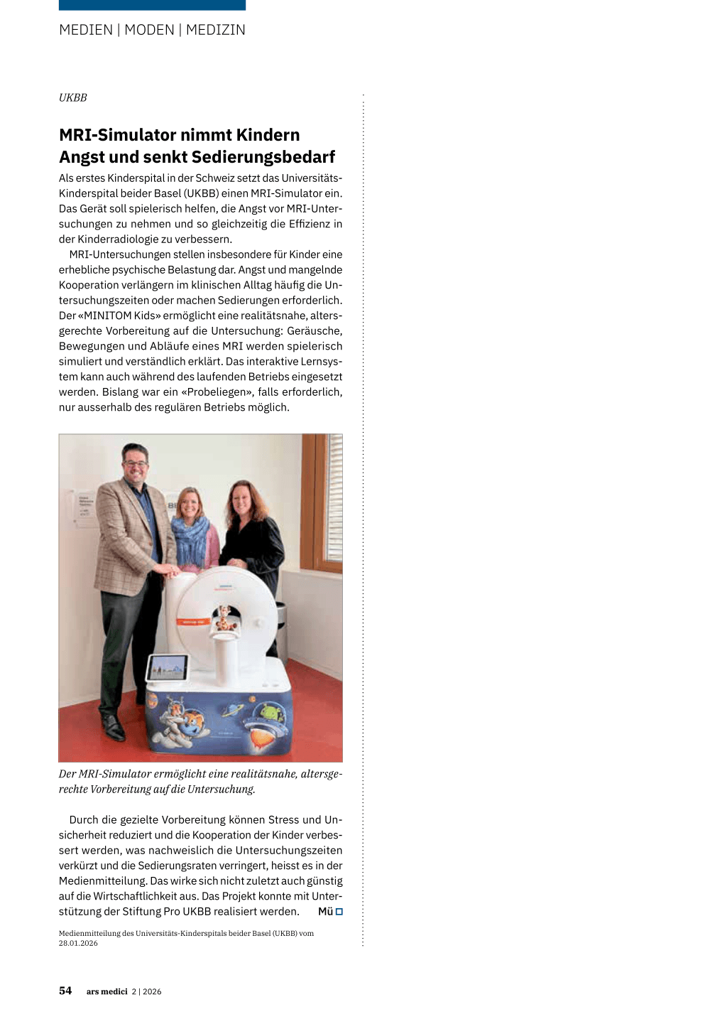 Durch die gezielte Vorbereitung können Stress und Unsicherheit reduziert und die Kooperation der Kinder verbessert werden, was nachweislich die Untersuchungszeiten verkürzt und die Sedierungsraten verringert, heisst es in der Medienmitteilung. Das wirke sich nicht zuletzt auch günstig auf die Wirtschaftlichkeit aus. Das Projekt konnte mit Unterstützung der Stiftung Pro UKBB realisiert werden. Mü