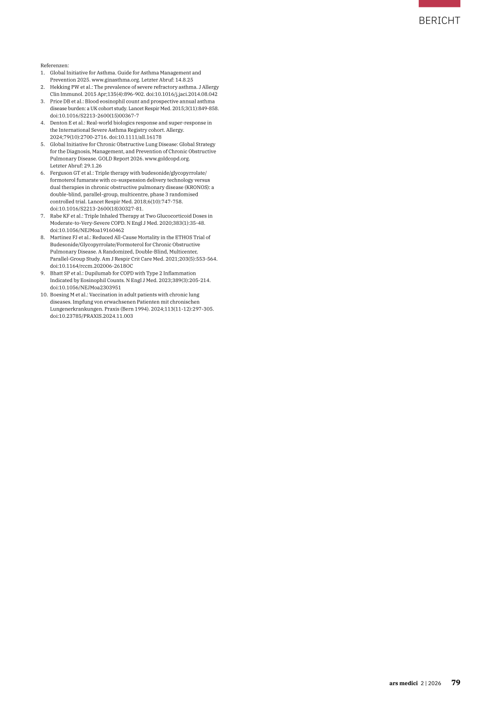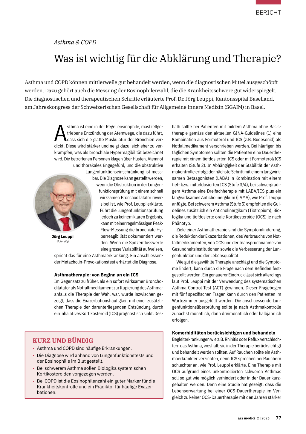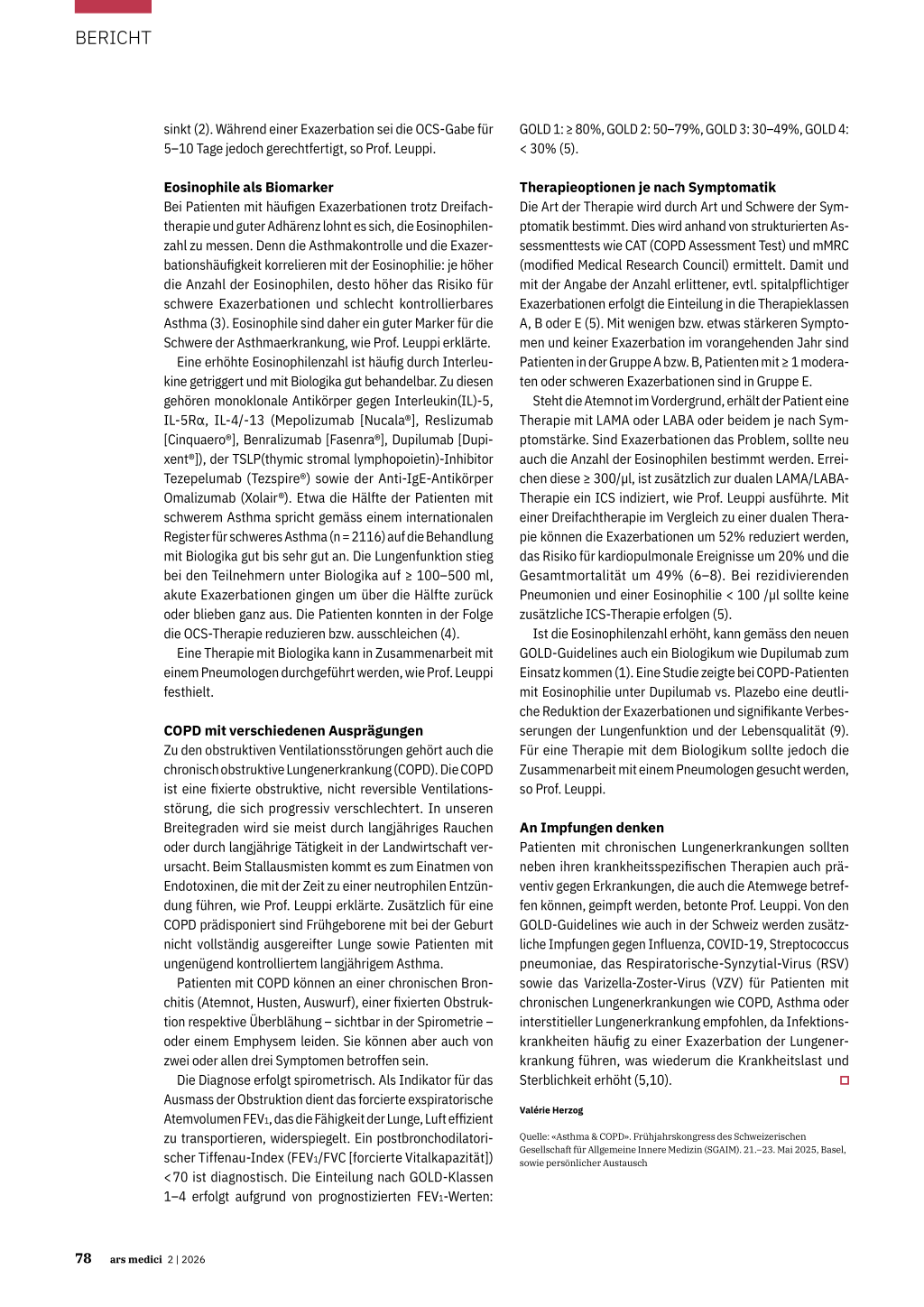 GOLD 1: ≥ 80%, GOLD 2: 50–79%, GOLD 3: 30–49%, GOLD 4: < 30% (5). Eosinophile als Biomarker Bei Patienten mit häufigen Exazerbationen trotz Dreifachtherapie und guter Adhärenz lohnt es sich, die Eosinophilenzahl zu messen. Denn die Asthmakontrolle und die Exazerbationshäufigkeit korrelieren mit der Eosinophilie: je höher die Anzahl der Eosinophilen, desto höher das Risiko für schwere Exazerbationen und schlecht kontrollierbares Asthma (3). Eosinophile sind daher ein guter Marker für die Schwere der Asthmaerkrankung, wie Prof. Leuppi erklärte. Eine erhöhte Eosinophilenzahl ist häufig durch Interleu kine getriggert und mit Biologika gut behandelbar. Zu diesen gehören monoklonale Antikörper gegen Interleukin(IL)-5, IL-5Rα, IL-4/-13 (Mepolizumab [Nucala®], Reslizumab [Cinquaero®], Benralizumab [Fasenra®], Dupilumab [Dupixent®]), der TSLP(thymic stromal lymphopoietin)-Inhibitor Tezepelumab (Tezspire®) sowie der Anti-IgE-Antikörper Omalizumab (Xolair®). Etwa die Hälfte der Patienten mit schwerem Asthma spricht gemäss einem internationalen Register für schweres Asthma (n = 2116) auf die Behandlung mit Biologika gut bis sehr gut an. Die Lungenfunktion stieg bei den Teilnehmern unter Biologika auf ≥ 100–500 ml, akute Exazerbationen gingen um über die Hälfte zurück oder blieben ganz aus. Die Patienten konnten in der Folge die OCS-Therapie reduzieren bzw. ausschleichen (4). Eine Therapie mit Biologika kann in Zusammenarbeit mit einem Pneumologen durchgeführt werden, wie Prof. Leuppi festhielt. COPD mit verschiedenen Ausprägungen Zu den obstruktiven Ventilationsstörungen gehört auch die chronisch obstruktive Lungenerkrankung (COPD). Die COPD ist eine fixierte obstruktive, nicht reversible Ventilationsstörung, die sich progressiv verschlechtert. In unseren Breitegraden wird sie meist durch langjähriges Rauchen oder durch langjährige Tätigkeit in der Landwirtschaft verursacht. Beim Stallausmisten kommt es zum Einatmen von Endotoxinen, die mit der Zeit zu einer neutrophilen Entzündung führen, wie Prof. Leuppi erklärte. Zusätzlich für eine COPD prädisponiert sind Frühgeborene mit bei der Geburt nicht vollständig ausgereifter Lunge sowie Patienten mit ungenügend kontrolliertem langjährigem Asthma. Patienten mit COPD können an einer chronischen Bronchitis (Atemnot, Husten, Auswurf), einer fixierten Obstruktion respektive Überblähung – sichtbar in der Spirometrie – oder einem Emphysem leiden. Sie können aber auch von zwei oder allen drei Symptomen betroffen sein. Die Diagnose erfolgt spirometrisch. Als Indikator für das Ausmass der Obstruktion dient das forcierte exspiratorische Atemvolumen FEV1, das die Fähigkeit der Lunge, Luft effizient zu transportieren, widerspiegelt. Ein postbronchodilatorischer Tiffenau-Index (FEV1/FVC [forcierte Vitalkapazität]) < 70 ist diagnostisch. Die Einteilung nach GOLD-Klassen 1–4 erfolgt aufgrund von prognostizierten FEV1-Werten: Therapieoptionen je nach Symptomatik Die Art der Therapie wird durch Art und Schwere der Sym ptomatik bestimmt. Dies wird anhand von strukturierten Assessmenttests wie CAT (COPD Assessment Test) und mMRC (modified Medical Research Council) ermittelt. Damit und mit der Angabe der Anzahl erlittener, evtl. spitalpflichtiger Exazerbationen erfolgt die Einteilung in die Therapieklassen A, B oder E (5). Mit wenigen bzw. etwas stärkeren Symptomen und keiner Exazerbation im vorangehenden Jahr sind Patienten in der Gruppe A bzw. B, Patienten mit ≥ 1 moderaten oder schweren Exazerbationen sind in Gruppe E. Steht die Atemnot im Vordergrund, erhält der Patient eine Therapie mit LAMA oder LABA oder beidem je nach Sym ptomstärke. Sind Exazerbationen das Problem, sollte neu auch die Anzahl der Eosinophilen bestimmt werden. Erreichen diese ≥ 300/µl, ist zusätzlich zur dualen LAMA/LABATherapie ein ICS indiziert, wie Prof. Leuppi ausführte. Mit einer Dreifachtherapie im Vergleich zu einer dualen Therapie können die Exazerbationen um 52% reduziert werden, das Risiko für kardiopulmonale Ereignisse um 20% und die Gesamtmortalität um 49% (6–8). Bei rezidivierenden Pneumonien und einer Eosinophilie < 100 /µl sollte keine zusätzliche ICS-Therapie erfolgen (5). Ist die Eosinophilenzahl erhöht, kann gemäss den neuen GOLD-Guidelines auch ein Biologikum wie Dupilumab zum Einsatz kommen (1). Eine Studie zeigte bei COPD-Patienten mit Eosinophilie unter Dupilumab vs. Plazebo eine deutliche Reduktion der Exazerbationen und signifikante Verbesserungen der Lungenfunktion und der Lebensqualität (9). Für eine Therapie mit dem Biologikum sollte jedoch die Zusammenarbeit mit einem Pneumologen gesucht werden, so Prof. Leuppi. An Impfungen denken Patienten mit chronischen Lungenerkrankungen sollten neben ihren krankheitsspezifischen Therapien auch präventiv gegen Erkrankungen, die auch die Atemwege betreffen können, geimpft werden, betonte Prof. Leuppi. Von den GOLD-Guidelines wie auch in der Schweiz werden zusätzliche Impfungen gegen Influenza, COVID-19, Streptococcus pneumoniae, das Respiratorische-Synzytial-Virus (RSV) sowie das Varizella-Zoster-Virus (VZV) für Patienten mit chronischen Lungenerkrankungen wie COPD, Asthma oder interstitieller Lungenerkrankung empfohlen, da Infektionskrankheiten häufig zu einer Exazerbation der Lungenerkrankung führen, was wiederum die Krankheitslast und Sterblichkeit erhöht (5,10). Valérie Herzog Quelle: «Asthma & COPD». Frühjahrskongress des Schweizerischen Gesellschaft für Allgemeine Innere Medizin (SGAIM). 21.–23. Mai 2025, Basel, sowie persönlicher Austausch 78 ars medici 2 | 2026 Referenzen: 1. Global Initiative for Asthma. Guide for Asthma Management and Prevention 2025. www.ginasthma.org. Letzter Abruf: 14.8.25 2. Hekking PW et al.: The prevalence of severe refractory asthma. J Allergy Clin Immunol. 2015 Apr;135(4):896-902. doi:10.1016/j.jaci.2014.08.042 3. Price DB et al.: Blood eosinophil count and prospective annual asthma disease burden: a