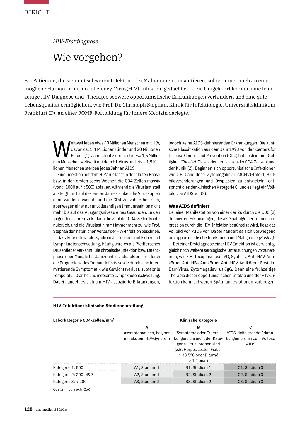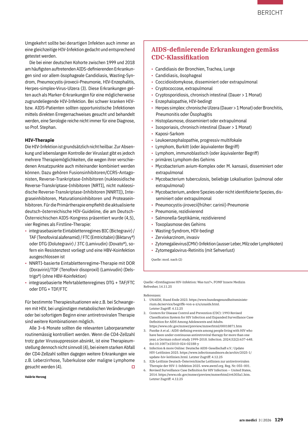 rium.de/service/begriffe-von-a-z/u/unaids.html. Letzter Zugriff: 4.12.25 2. Centers for Disease Control and Prevention (CDC): 1993 Revised Classification System for HIV Infection and Expanded Surveillance Case Definition for AIDS Among Adolescents and Adults. https://www.cdc.gov/mmwr/preview/mmwrhtml/00018871.htm 3. Pantke A et al.: AIDS-defining events among people living with HIV who have been under continuous antiretroviral therapy for more than one year, a German cohort study 1999-2018. Infection. 2024;52(2):637-648. doi:10.1007/s15010-024-02188-y 4. Infection & more Online: Deutsche AIDS-Gesellschaft e.V.: Update HIV-Leitlinien 2025. https://www.infectionandmore.de/archiv/2025-1/ update-hiv-leitlinien.html. Letzter Zugriff: 4.12.25 5. S2k-Leitlinie Deutsch-Österreichische Leitlinien zur antiretroviralen Therapie der HIV-1-Infektion 2025. www.awmf.org. Reg. Nr. 055–001. 6. Revised Surveillance Case Definition for HIV Infection — United States, 2014. https://www.cdc.gov/mmwr/preview/mmwrhtml/rr6303a1.htm. Letzter Zugriff: 4.12.25