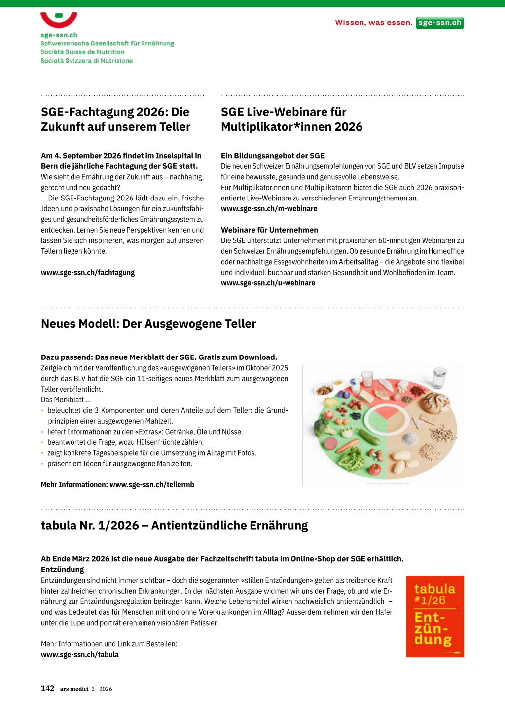 Ab Ende März 2026 ist die neue Ausgabe der Fachzeitschrift tabula im Online-Shop der SGE erhältlich. Entzündung Entzündungen sind nicht immer sichtbar – doch die sogenannten «stillen Entzündungen» gelten als treibende Kraft hinter zahlreichen chronischen Erkrankungen. In der nächsten Ausgabe widmen wir uns der Frage, ob und wie Ernährung zur Entzündungsregulation beitragen kann. Welche Lebensmittel wirken nachweislich antientzündlich – und was bedeutet das für Menschen mit und ohne Vorerkrankungen im Alltag? Ausserdem nehmen wir den Hafer unter die Lupe und porträtieren einen visionären Patissier.
