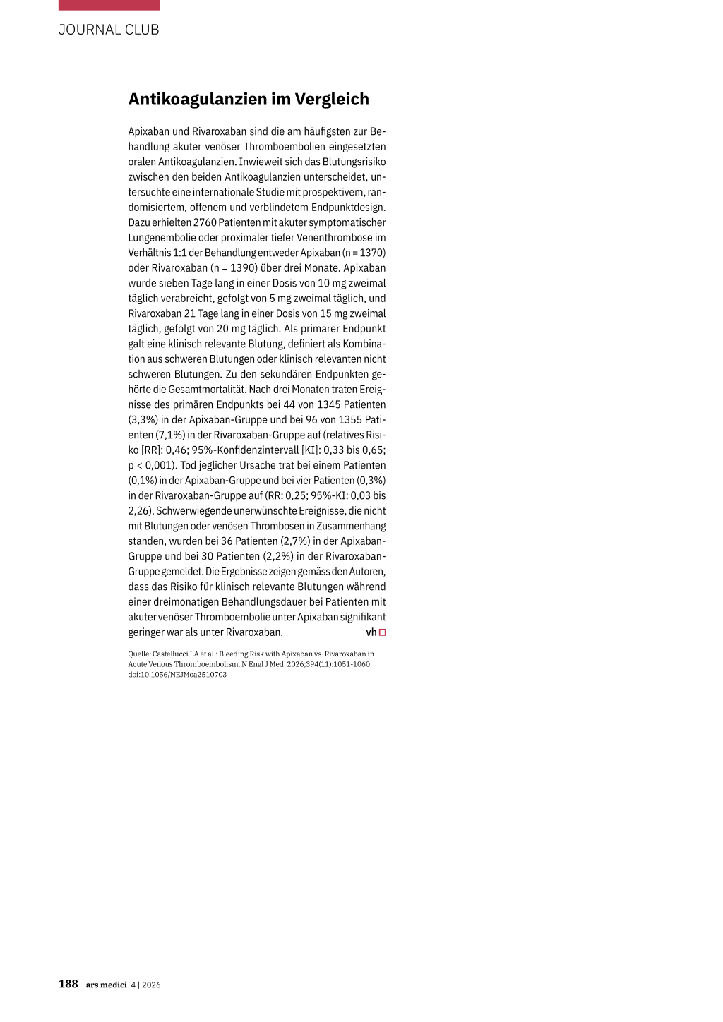 p < 0,001). Tod jeglicher Ursache trat bei einem Patienten (0,1%) in der Apixaban-Gruppe und bei vier Patienten (0,3%) in der Rivaroxaban-Gruppe auf (RR: 0,25; 95%-KI: 0,03 bis 2,26). Schwerwiegende unerwünschte Ereignisse, die nicht mit Blutungen oder venösen Thrombosen in Zusammenhang standen, wurden bei 36 Patienten (2,7%) in der Apixaban- Gruppe und bei 30 Patienten (2,2%) in der Rivaroxaban- Gruppe gemeldet. Die Ergebnisse zeigen gemäss den Autoren, dass das Risiko für klinisch relevante Blutungen während einer dreimonatigen Behandlungsdauer bei Patienten mit akuter venöser Thromboembolie unter Apixaban signifikant geringer war als unter Rivaroxaban. vh Quelle: Castellucci LA et al.: Bleeding Risk with Apixaban vs. Rivaroxaban in Acute Venous Thromboembolism. N Engl J Med. 2026;394(11):1051-1060. doi:10.1056/NEJMoa2510703 188 ars medici 4 | 2026