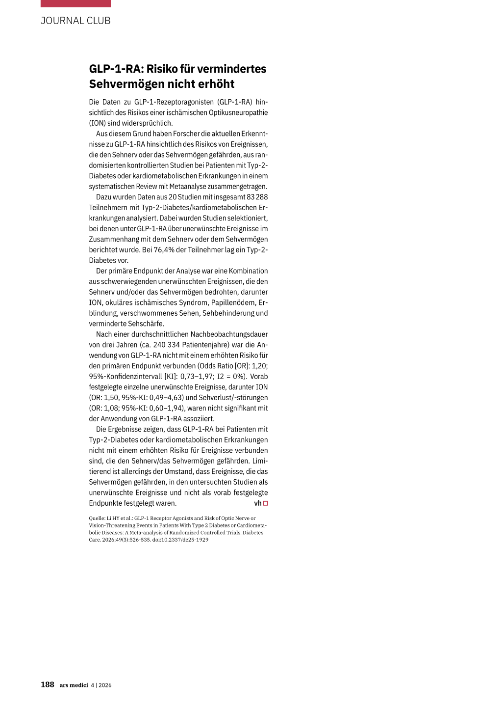 Quelle: Li HY et al.: GLP-1 Receptor Agonists and Risk of Optic Nerve or Vision-Threatening Events in Patients With Type 2 Diabetes or Cardiometabolic Diseases: A Meta-analysis of Randomized Controlled Trials. Diabetes Care. 2026;49(3):526-535. doi:10.2337/dc25-1929