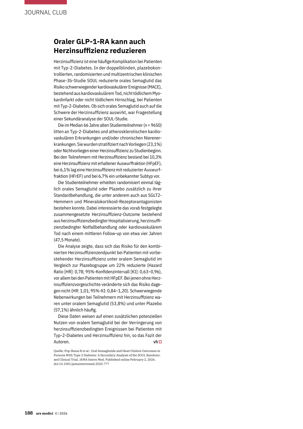 Quelle: Pop-Busui R et al.: Oral Semaglutide and Heart Failure Outcomes in Persons With Type 2 Diabetes: A Secondary Analysis of the SOUL Randomized Clinical Trial. JAMA Intern Med. Published online February 2, 2026. doi:10.1001/jamainternmed.2025.777