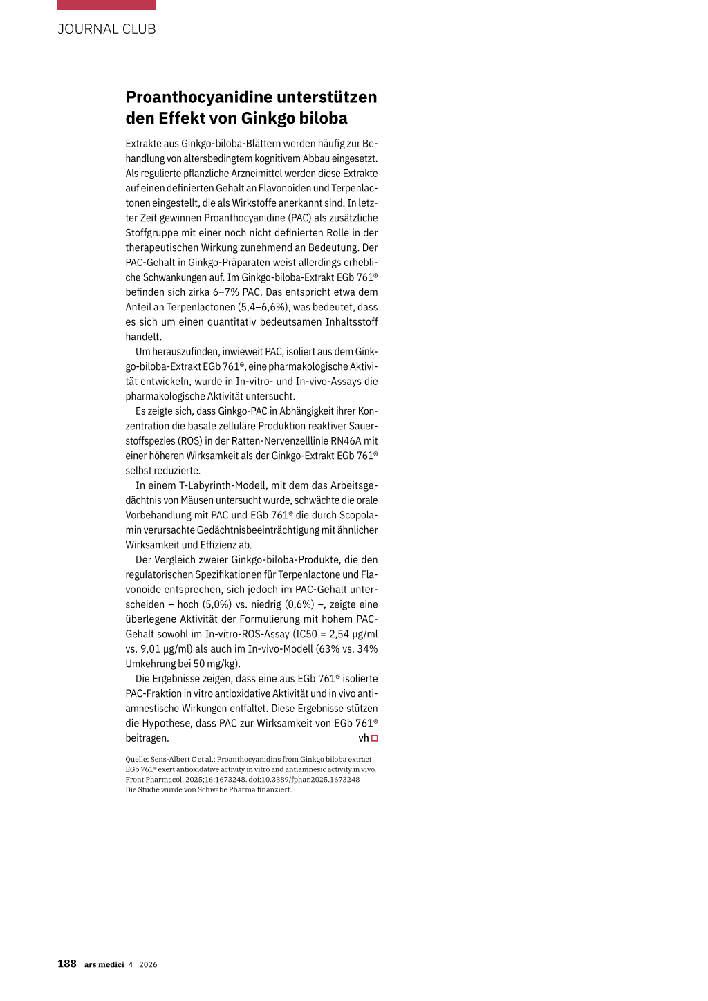 Quelle: Sens-Albert C et al.: Proanthocyanidins from Ginkgo biloba extract EGb 761® exert antioxidative activity in vitro and antiamnesic activity in vivo. Front Pharmacol. 2025;16:1673248. doi:10.3389/fphar.2025.1673248 Die Studie wurde von Schwabe Pharma finanziert.