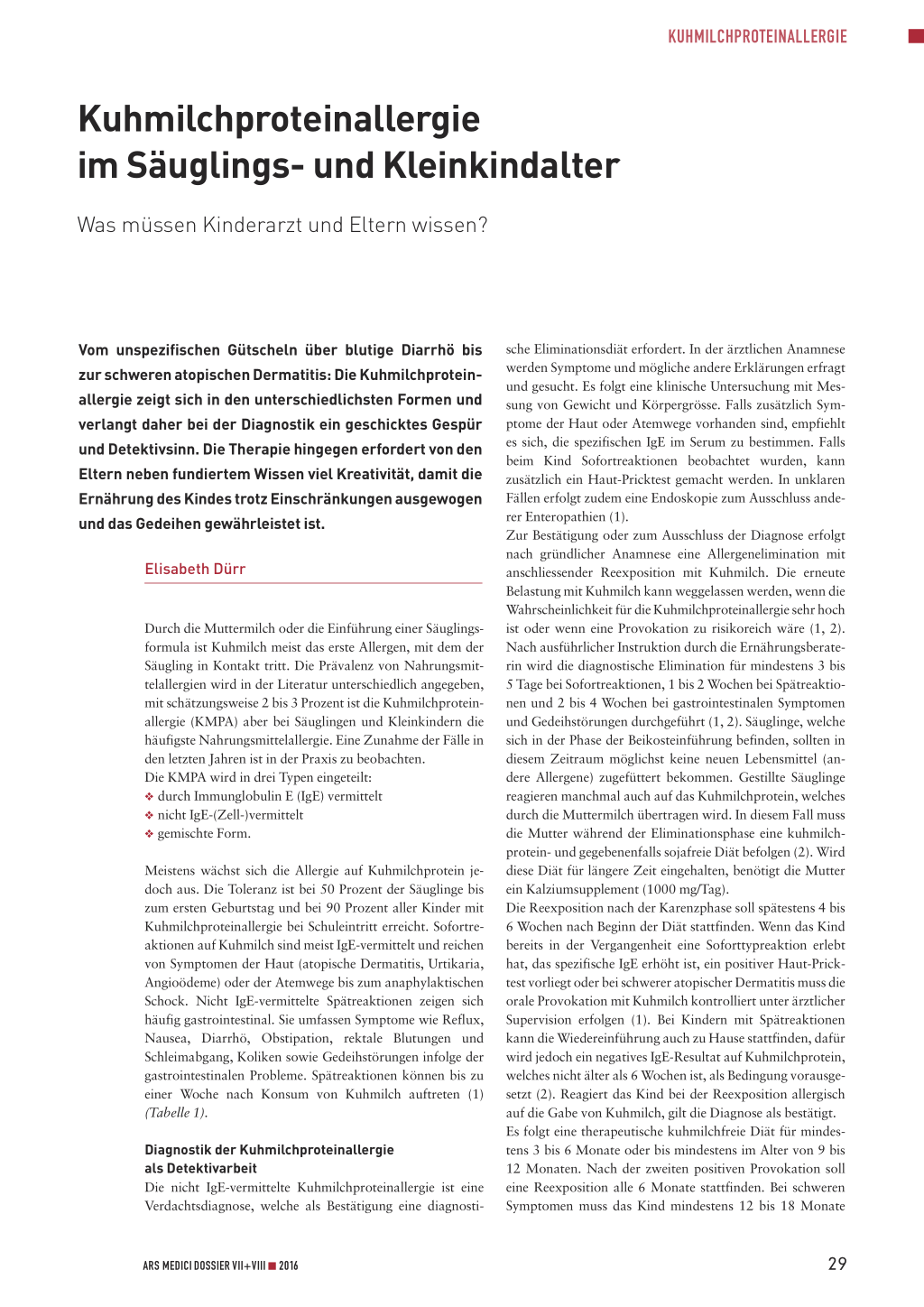 sche Eliminationsdiät erfordert. In der ärztlichen Anamnese werden Symptome und mögliche andere Erklärungen erfragt und gesucht. Es folgt eine klinische Untersuchung mit Messung von Gewicht und Körpergrösse. Falls zusätzlich Symptome der Haut oder Atemwege vorhanden sind, empfiehlt es sich, die spezifischen IgE im Serum zu bestimmen. Falls beim Kind Sofortreaktionen beobachtet wurden, kann zusätzlich ein Haut-Pricktest gemacht werden. In unklaren Fällen erfolgt zudem eine Endoskopie zum Ausschluss anderer Enteropathien (1). Zur Bestätigung oder zum Ausschluss der Diagnose erfolgt nach gründlicher Anamnese eine Allergenelimination mit anschliessender Reexposition mit Kuhmilch. Die erneute Belastung mit Kuhmilch kann weggelassen werden, wenn die Wahrscheinlichkeit für die Kuhmilchproteinallergie sehr hoch ist oder wenn eine Provokation zu risikoreich wäre (1, 2). Nach ausführlicher Instruktion durch die Ernährungsberaterin wird die diagnostische Elimination für mindestens 3 bis 5 Tage bei Sofortreaktionen, 1 bis 2 Wochen bei Spätreaktionen und 2 bis 4 Wochen bei gastrointestinalen Symptomen und Gedeihstörungen durchgeführt (1, 2). Säuglinge, welche sich in der Phase der Beikosteinführung befinden, sollten in diesem Zeitraum möglichst keine neuen Lebensmittel (andere Allergene) zugefüttert bekommen. Gestillte Säuglinge reagieren manchmal auch auf das Kuhmilchprotein, welches durch die Muttermilch übertragen wird. In diesem Fall muss die Mutter während der Eliminationsphase eine kuhmilchprotein- und gegebenenfalls sojafreie Diät befolgen (2). Wird diese Diät für längere Zeit eingehalten, benötigt die Mutter ein Kalziumsupplement (1000 mg/Tag). Die Reexposition nach der Karenzphase soll spätestens 4 bis 6 Wochen nach Beginn der Diät stattfinden. Wenn das Kind bereits in der Vergangenheit eine Soforttypreaktion erlebt hat, das spezifische IgE erhöht ist, ein positiver Haut-Pricktest vorliegt oder bei schwerer atopischer Dermatitis muss die orale Provokation mit Kuhmilch kontrolliert unter ärztlicher Supervision erfolgen (1). Bei Kindern mit Spätreaktionen kann die Wiedereinführung auch zu Hause stattfinden, dafür wird jedoch ein negatives IgE-Resultat auf Kuhmilchprotein, welches nicht älter als 6 Wochen ist, als Bedingung vorausgesetzt (2). Reagiert das Kind bei der Reexposition allergisch auf die Gabe von Kuhmilch, gilt die Diagnose als bestätigt. Es folgt eine therapeutische kuhmilchfreie Diät für mindestens 3 bis 6 Monate oder bis mindestens im Alter von 9 bis 12 Monaten. Nach der zweiten positiven Provokation soll eine Reexposition alle 6 Monate stattfinden. Bei schweren Symptomen muss das Kind mindestens 12 bis 18 Monate