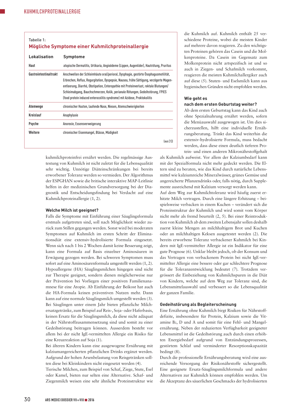 Durch die Muttermilch oder die Einführung einer Säuglingsformula ist Kuhmilch meist das erste Allergen, mit dem der Säugling in Kontakt tritt. Die Prävalenz von Nahrungsmittelallergien wird in der Literatur unterschiedlich angegeben, mit schätzungsweise 2 bis 3 Prozent ist die Kuhmilchproteinallergie (KMPA) aber bei Säuglingen und Kleinkindern die häufigste Nahrungsmittelallergie. Eine Zunahme der Fälle in den letzten Jahren ist in der Praxis zu beobachten. Die KMPA wird in drei Typen eingeteilt: O durch Immunglobulin E (IgE) vermittelt O nicht IgE-(Zell-)vermittelt O gemischte Form.